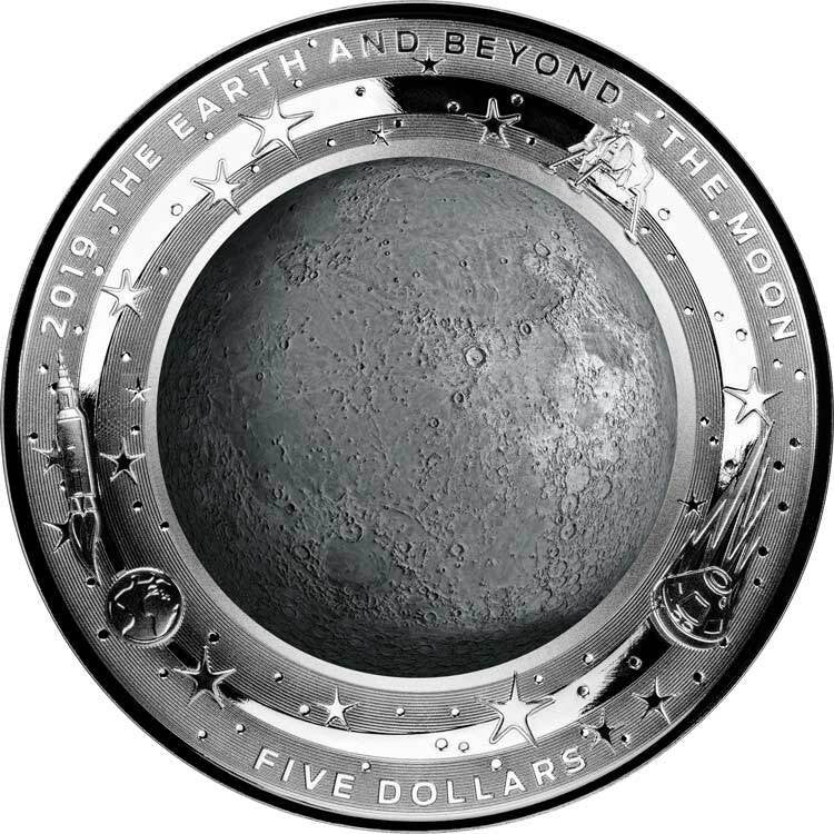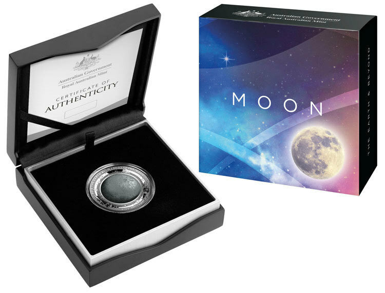• Coin’s reverse, coloured on the convex surface, features a detailed image of the Moon’s surface