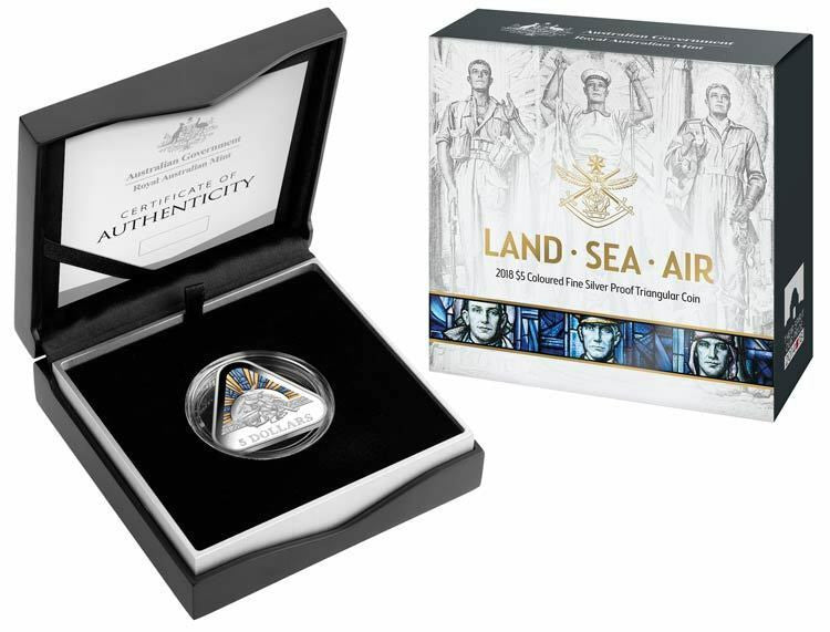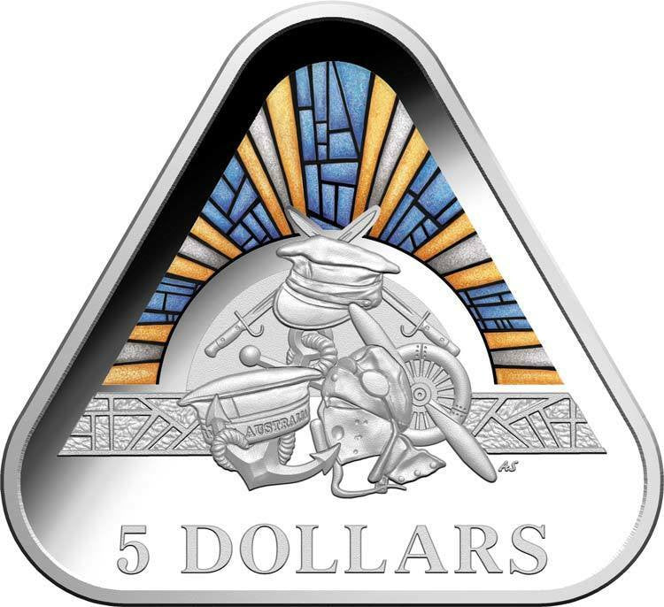This unique colour printed triangular proof coin commemorates the efforts and sacrifice of the Australian Defence Force, comprised of the Australian Army, the Royal Australian Air Force and the Royal Australian Navy. This is the final triangular coin design to feature the spectacular stained glass artwork from the Hall of Memory in the Australian War Memorial.