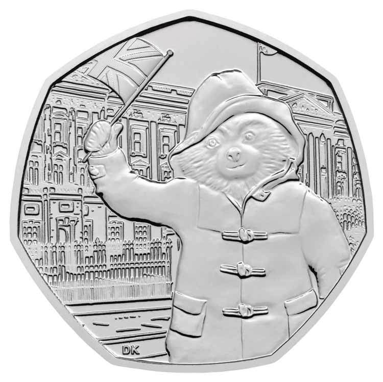 The majestic fa?ade of Buckingham Palace is unmistakeable in this coin's clever reverse design. In the foreground, Paddington is dressed in his iconic outfit, and happily waving a British flag.