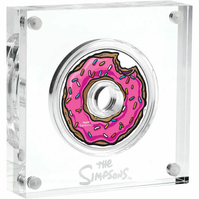The coin has the centre stamped out for a true donut design and depicts Homer’s iconic pink-frosted donut with sprinkles