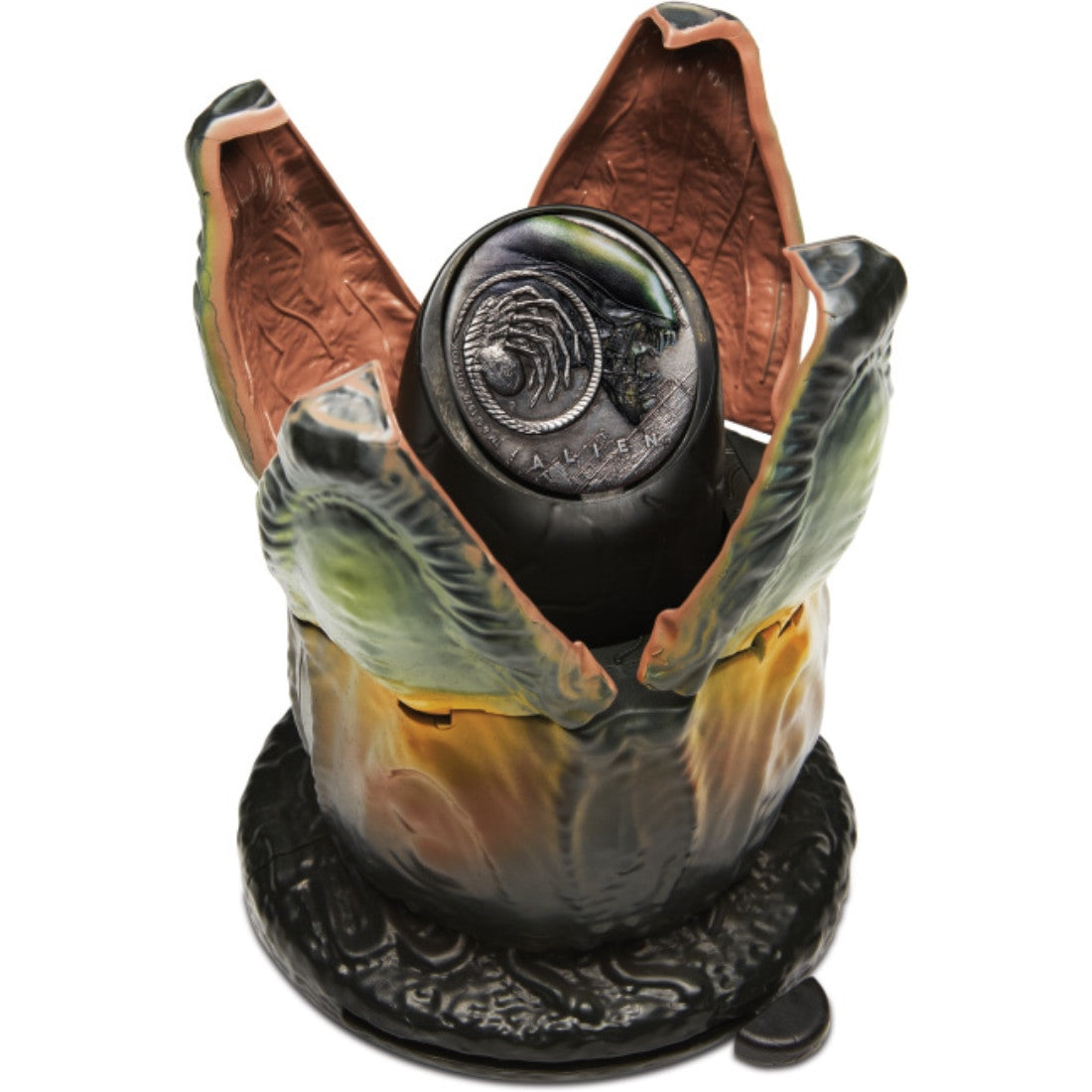 The coin is housed in a coloured egg-shaped case inspired by the oval pods in which alien life first appeared in the presence of the Nostromo landing party. The case opens to reveal four pink petal-shaped membranes as per the alien egg’s hatching process. The coin is displayed in an acrylic case with a cracked appearance which rises as the egg opens. Packaged in a themed shipper, the coin is accompanied by a numbered Certificate of Authenticity.
