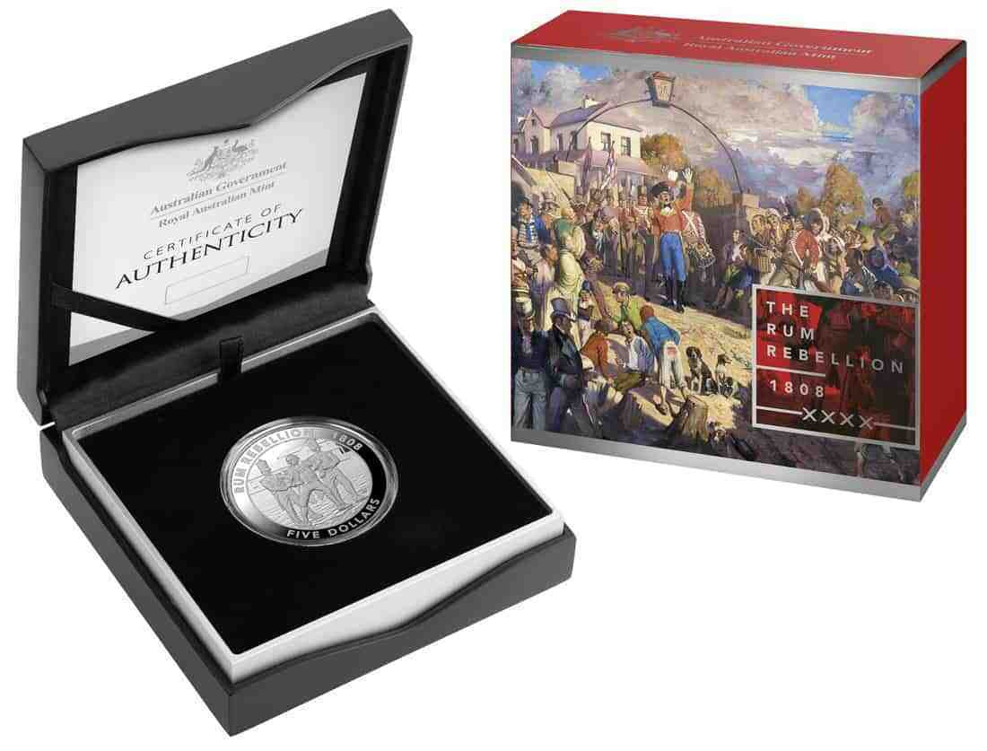 * 2019 $5 Ag 40mm Proof Coin - Mutiny and Rebellion - The Rum Rebellion