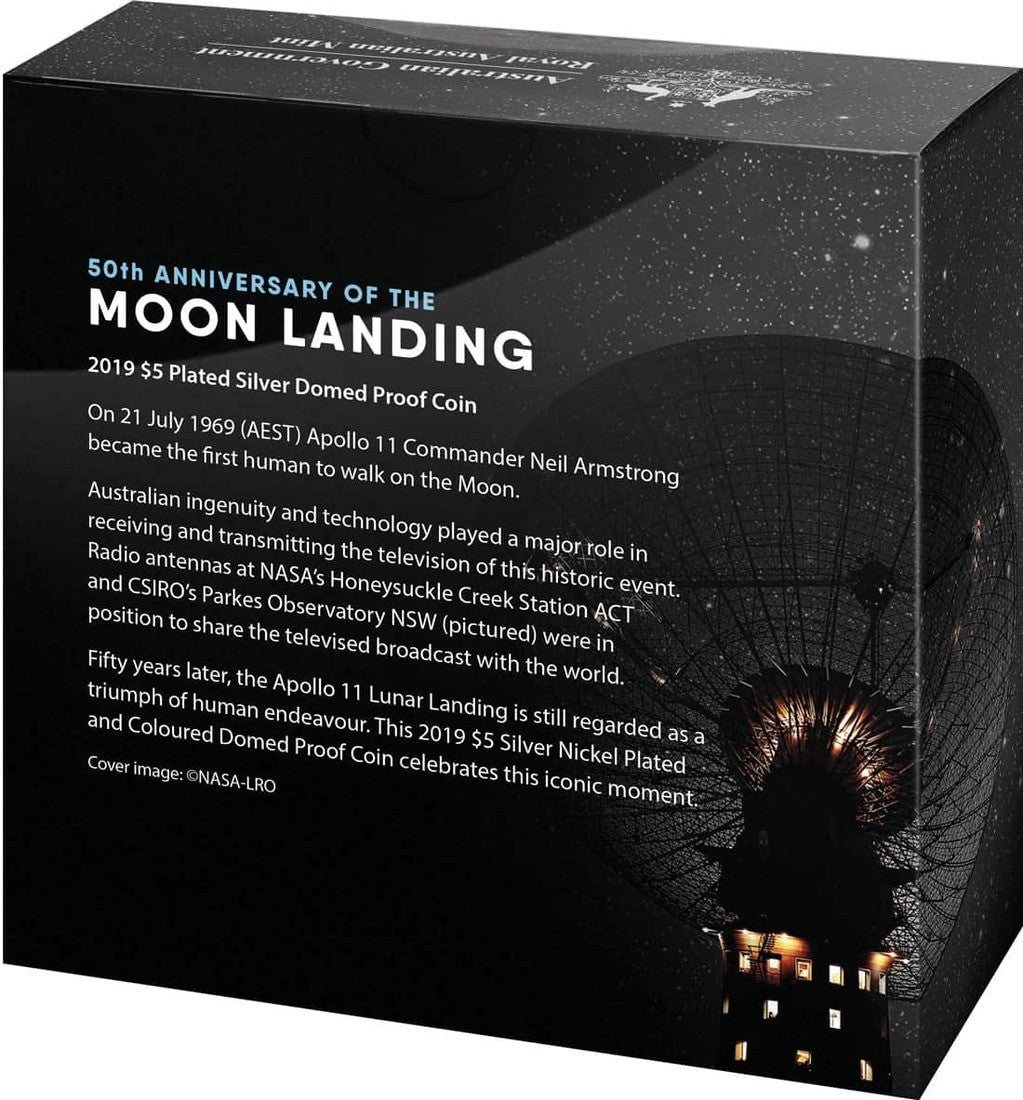 On 21 July 1969, an estimated 600 million television viewers watched as the first humans walked on the Moon. Most of these incredible images were shared with the world by two Australian radio antennas in Honeysuckle Creek ACT and Parkes NSW. The 50th anniversary of the Apollo 11 Lunar landing is celebrated in this exceptional 2019 $5 Silver Nickel Plated Coloured Domed Proof Coin, which is sure to delight space enthusiasts and coin collectors.