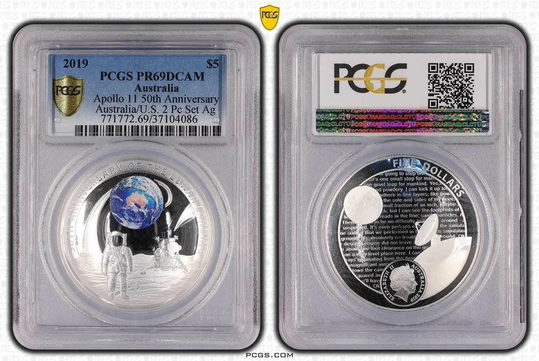 2019 $5 Apollo 11 50th Anniversary Australia/U.S. 2 Pc Set Ag, PR69DCAM (Proof)