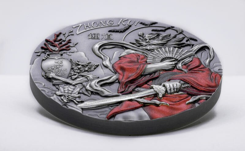 First coin in a new series: Asian Mythology. Smartminted(r) on a 50mm 3oz silver blank in high relief. Antique finished with partial color (red) and partial proof finish (the sword). Make sure to get the first coin in the series as just 333 pcs are released.