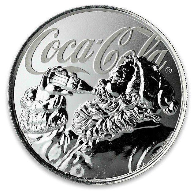 The obverse of the coin features the iconic image of Santa Claus enjoying an ice-cold Coke. The detailed artwork is skillfully sculpted and struck in crisp, pure silver. The original image was painted by artist Fred Mizen in 1930 for a Coca-Cola ad and depicted Santa in a crowd drinking a bottle of Coke.
