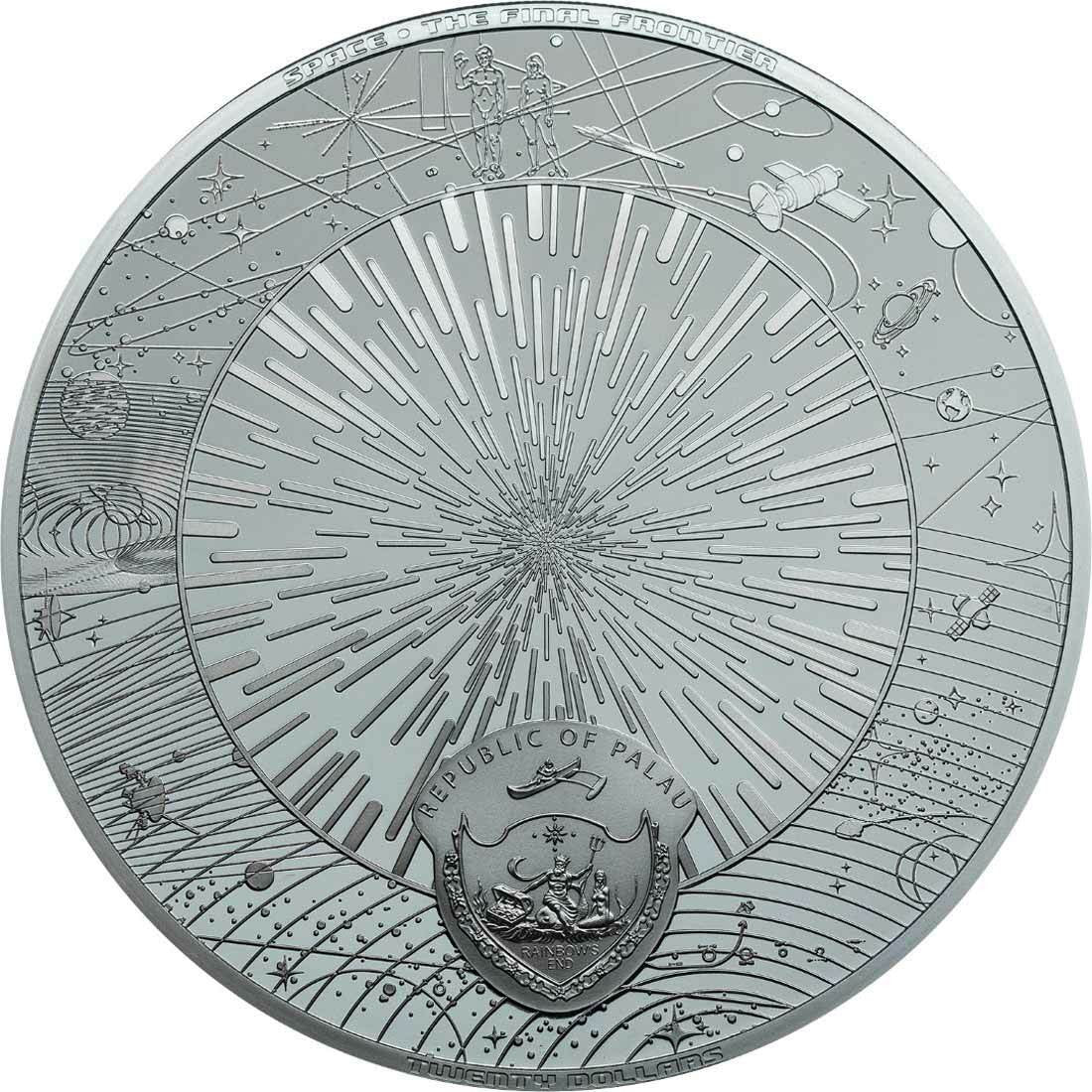 The Universe is the first release in a stunning "Space; the final frontier" series. Minted on a 65mm 3oz black proof blank showing the full observable universe. Artist's logarithmic scale conception of the observable universe with the Solar System at the center, galaxies, cosmic web and the Big Bang's invisible plasma on the edge.