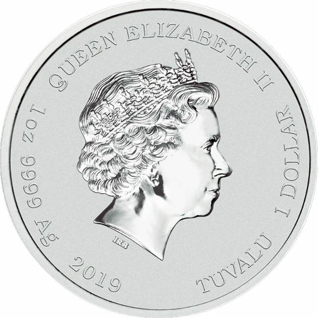 The obverse features Ian Rand Broadley’s effigy of Her Majesty Queen Elizabeth II, along with the purity of 9999 and legal tender denomination of $1 from Tuvalu.