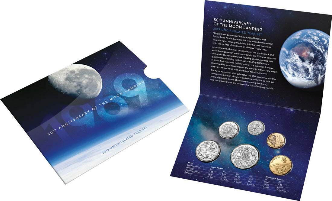 · Sets include two unique coins: a 5 cent coin representing the Moon with the Apollo 11 landing site, and a $1 coin representing Earth and the Honeysuckle Creek Tracking Station.