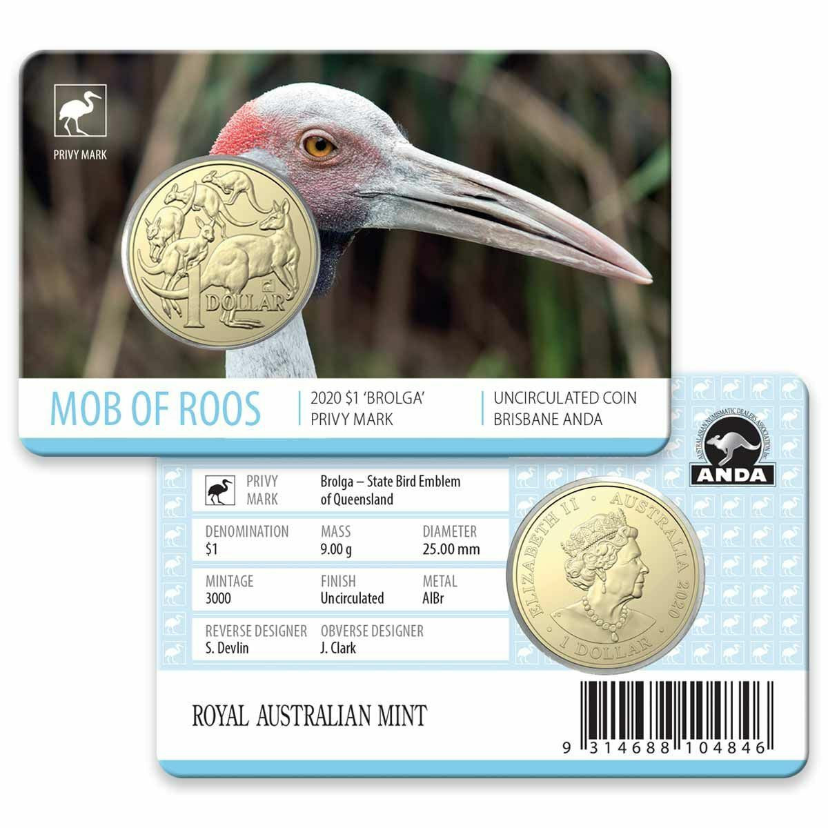 2020 $1 Mob of Roos 'Brolga' Privymark Uncirculated Coin Brisbane Money Expo