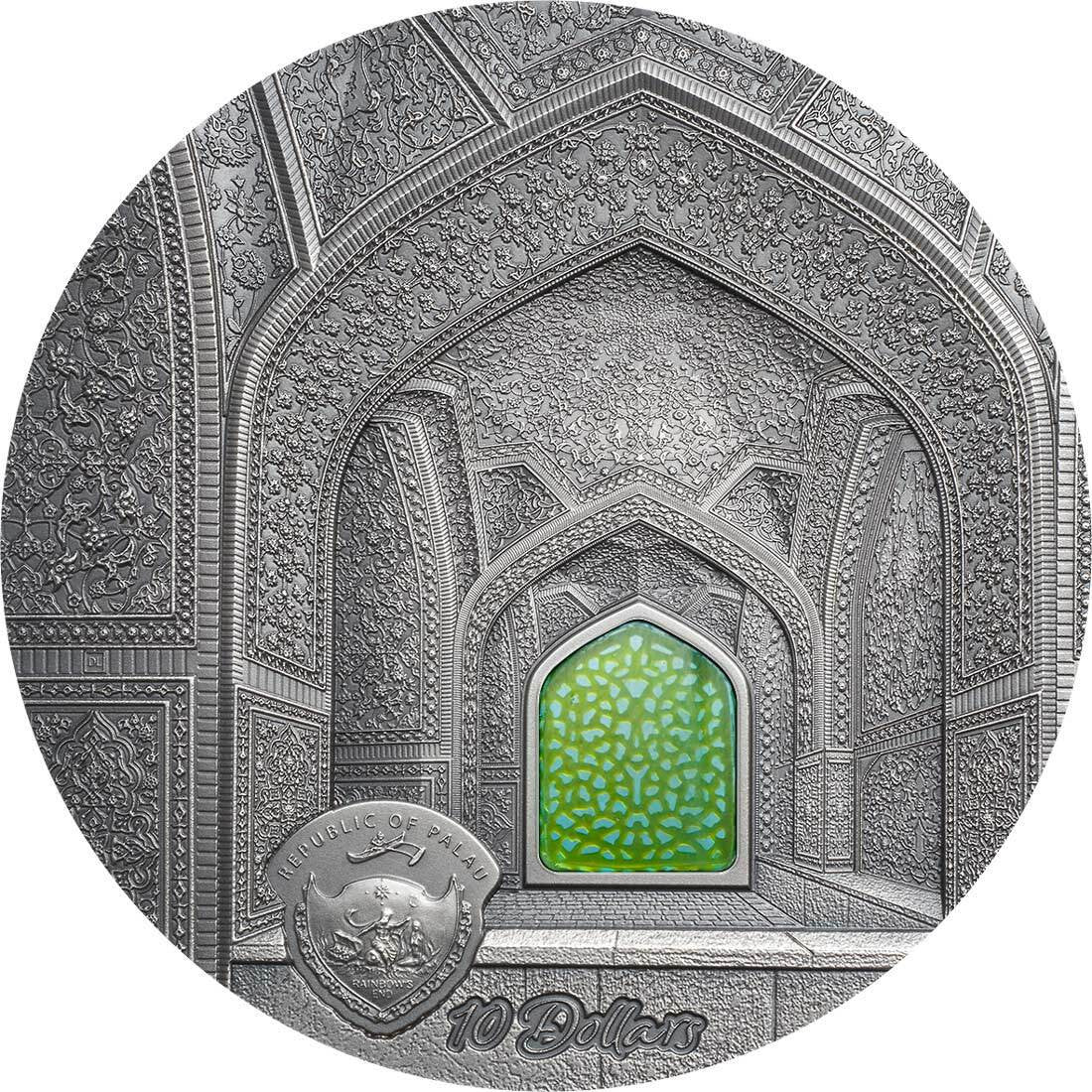 This year’s “Tiffany Art” Edition represents the final 2 oz silver issue in this multi-year award winning series. The series has been a numismatic classic ever since its release back in 2004 and this release is a fitting finale. This magnificent piece highlights the architectural wonder of Naghsh-e Jahan Square in Isfahan, Iran, also known as Imam Square. This Unesco World Heritage site is one of the largest city center squares in the world and a treasure of Persian architecture and art.The highly detailed relief honors the architecture of the Sheikh Lotfollah Mosque that is located on the east side of the city square. With its magnificent arches and tile work, it amazes all visitors.