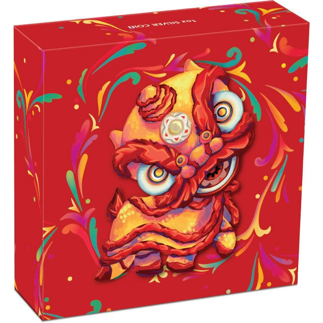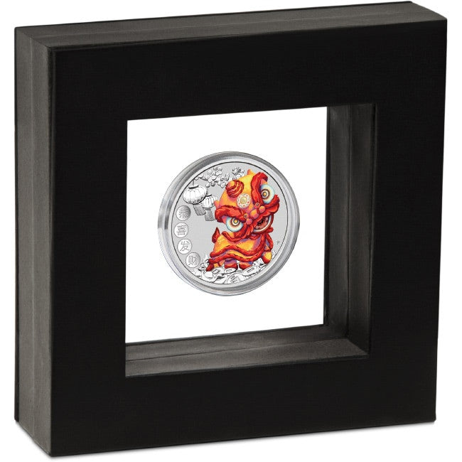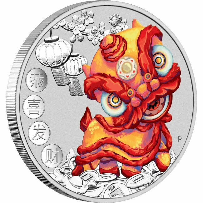 The reverse of the coin features a coloured representation of a Chinese lion dance with ancient Chinese coins, flowers and lanterns. Also included in the design are the Chinese characters, a common phrase said to wish one a happy and prosperous New Year, and The Perth Mint’s traditional ‘P’ mintmark.