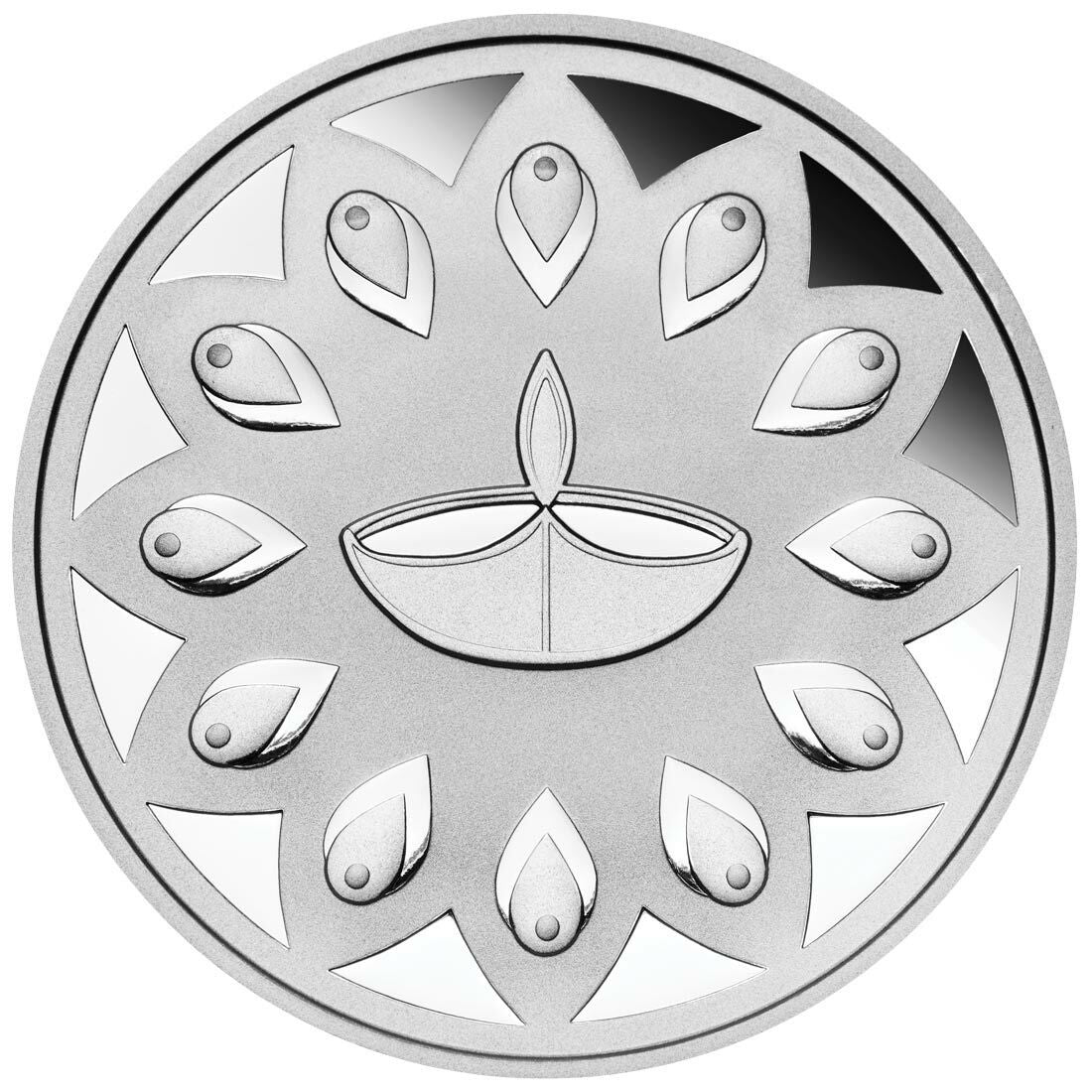 The medallion’s obverse design depicts a diya oil lamp surrounded by flower petals in a rangoli-inspired pattern.
