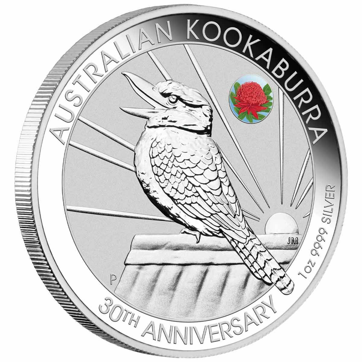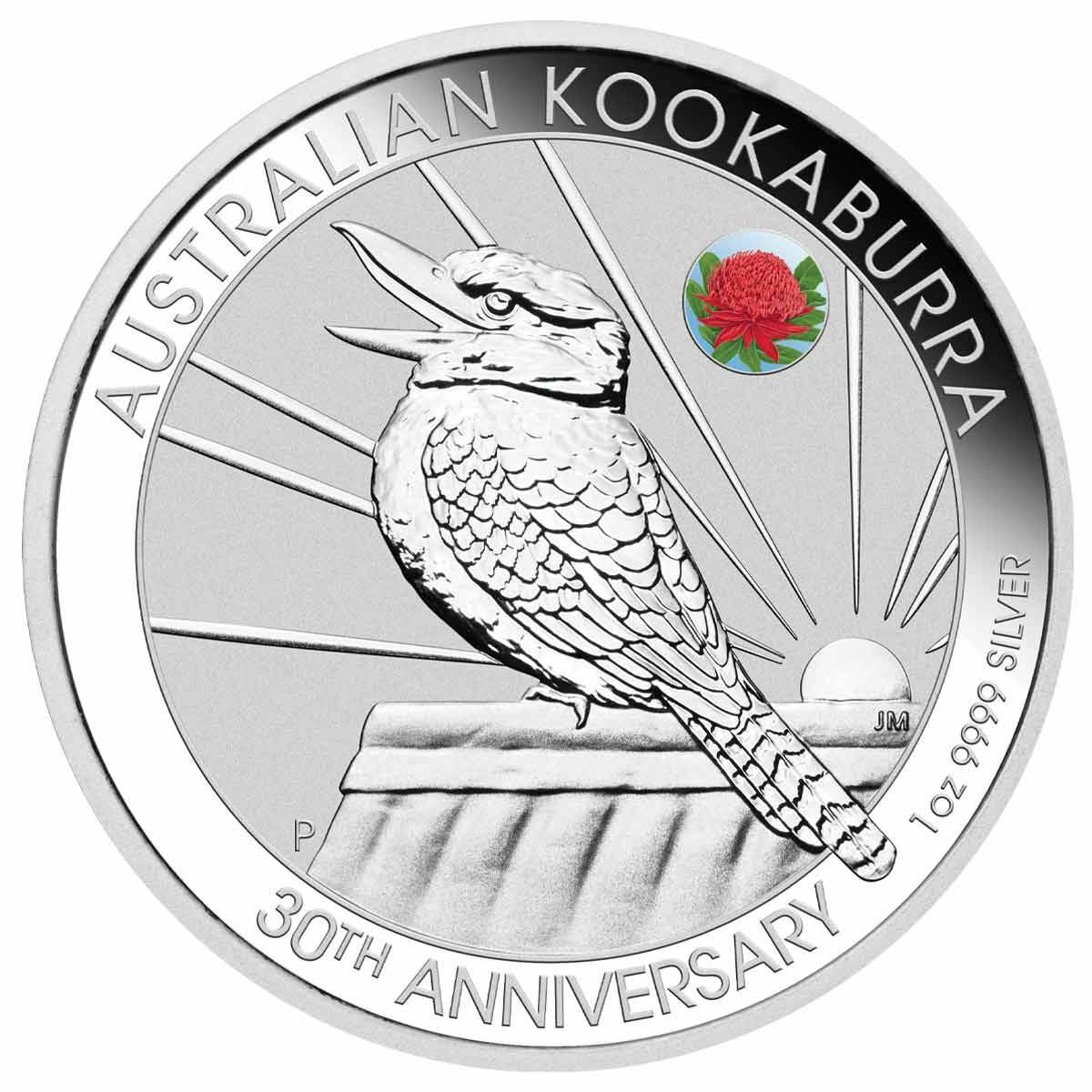 The design depicts a representation of a kookaburra perched on a roof at dawn with stylised rays of light in the background. Also included in the design is a privy mark with a coloured representation of a Waratah, the inscription ‘AUSTRALIAN KOOKABURRA 30TH ANNIVERSARY’, The Perth Mint’s ‘P’ mintmark, and the weight and purity.