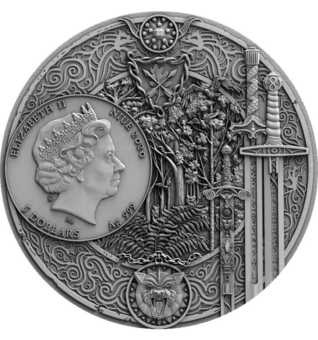 The Sword of Destiny coin is struck in 62.2 grams of pure silver. The reverse, 45 mm in diameter, shows two scenes that appear at the beginning and end of the story.