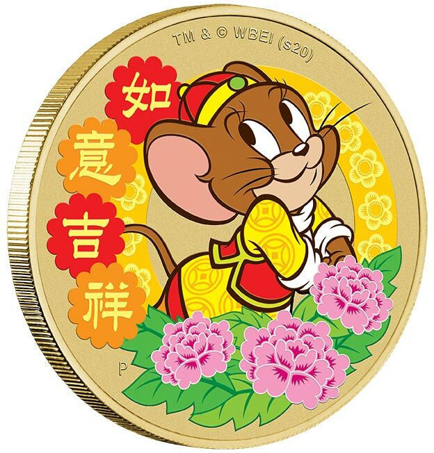 The coin’s reverse design features a coloured image of JERRY the Mouse in traditional Chinese clothing with stylised flowers and leaves in the background along with Chinese symbols 如 意 吉 祥 which means ‘Best Wishes’. The design also includes the trademark ‘TM & WBEI (s20)’, and The Perth Mint’s ‘P’ mintmark.