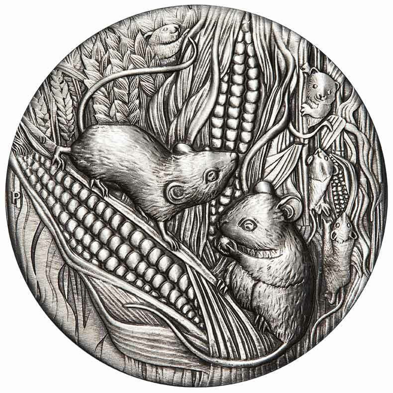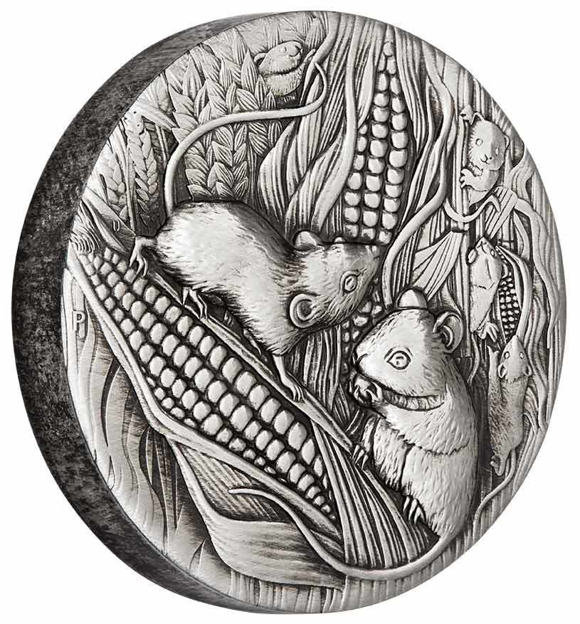 The coin’s reverse portrays two mice foraging on husks of corn in the foreground and mice among stalks of corn and wheat in the background. Also included in the design is The Perth Mint’s ‘P’ mintmark.