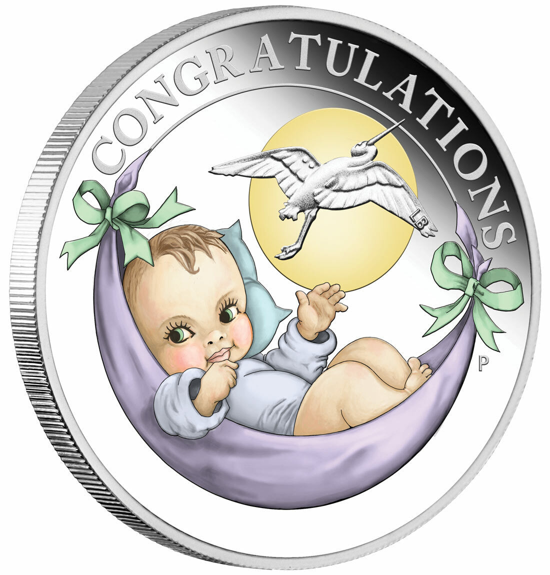 The coin’s reverse features a newborn in a baby carrying sling, with a flying stork and the moon in the background. The inscription CONGRATULATIONS and The Perth Mint’s traditional ‘P’ mintmark are also included in the design.