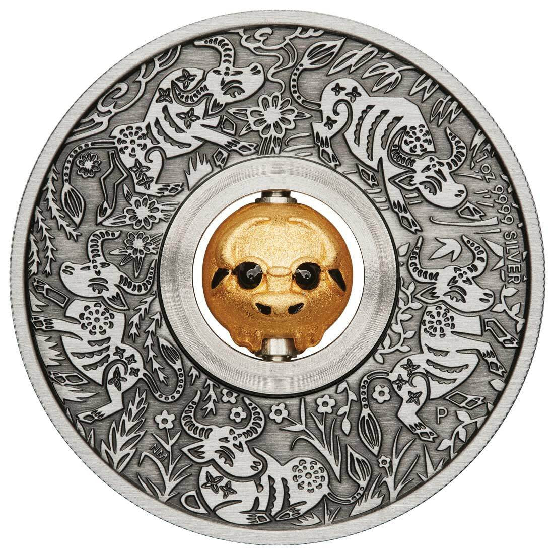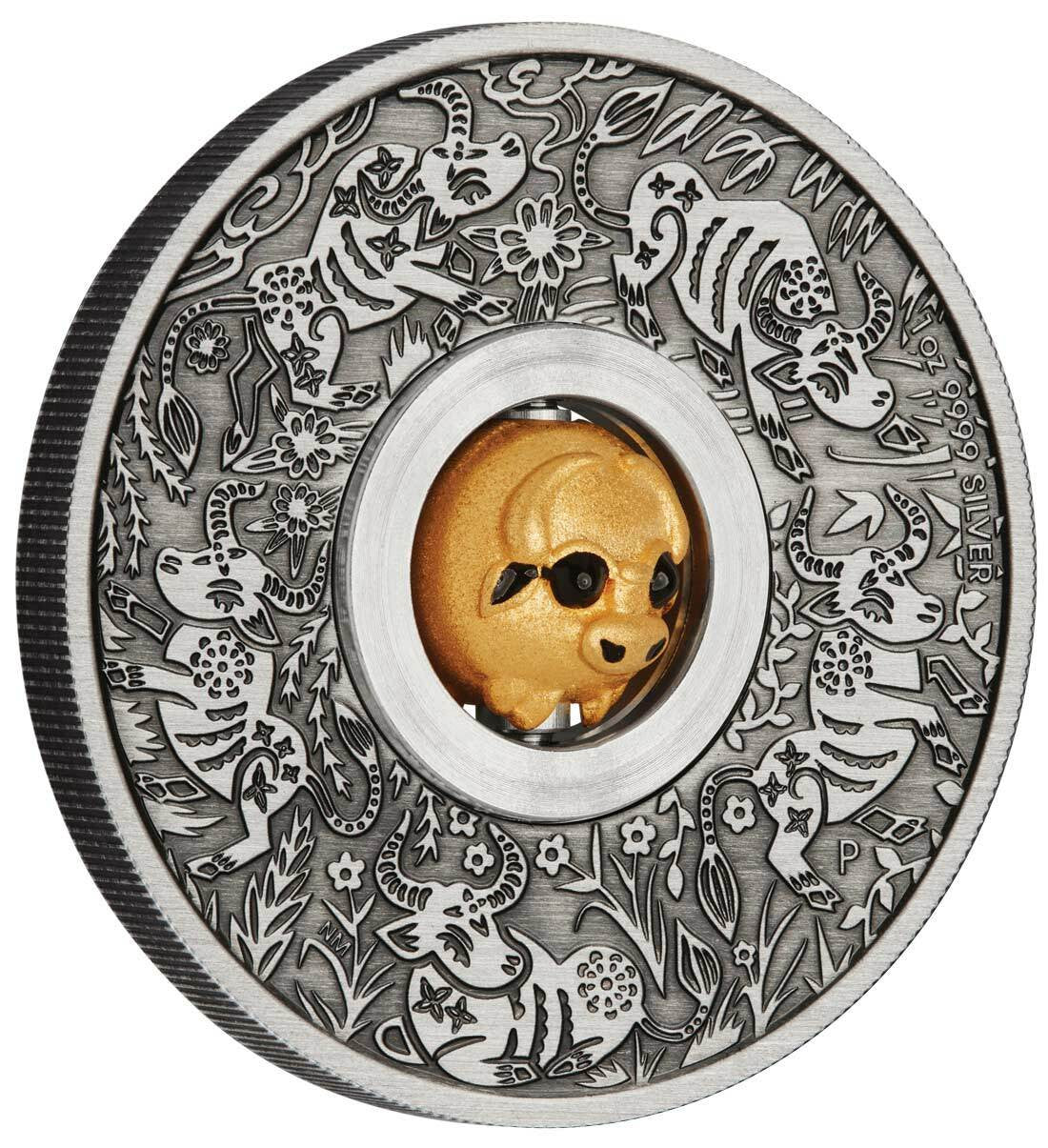 This 1oz silver antiqued coin features a central gold-plated rotating charm in the shape of the second animal in the ancient Chinese lunar calendar, the ox.