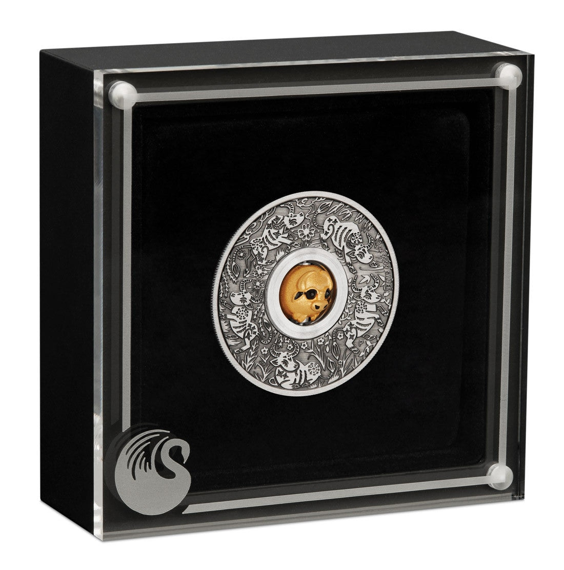 The coin incorporates a rotating gold-plated sterling silver bead resembling the form of an ox. It is surrounded on the reverse by artistic portrayals of oxen among floral motifs. As well as The Perth Mint’s ‘P’ mintmark, the reverse also includes the coin’s weight and fineness.
