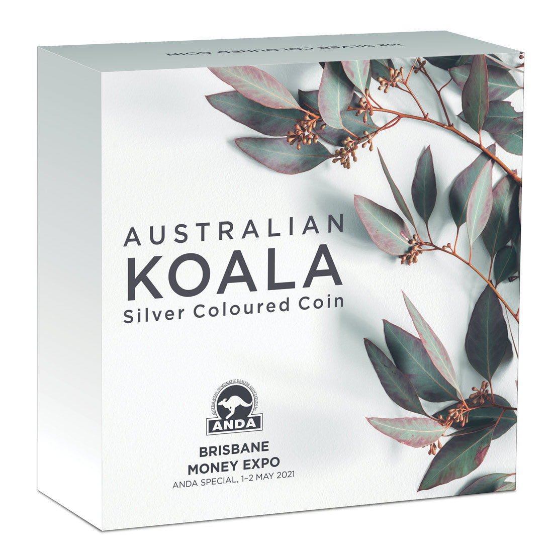 Accompanied by a numbered Certificate of Authenticity, the coin is housed in a classic display case with a clear lid and a shipper featuring an illustration of gum tree leaves and the Brisbane Money Expo ANDA logo.