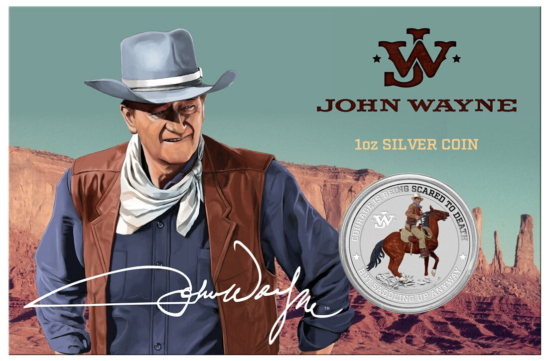 We are excited to present this officially licensed John Wayne 1oz Silver Coloured Coin in Card.