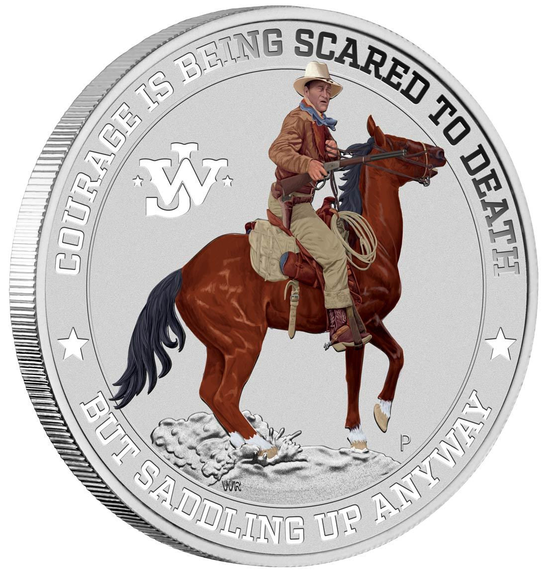 The reverse of the coin depicts John Wayne on horseback wearing his trademark cowboy hat with the iconic “JW” logo. The design also includes his famous quote ‘COURAGE IS BEING SCARED TO DEATH – BUT SADDLING UP ANYWAY” and The Perth Mint’s traditional ‘P’ mintmark.