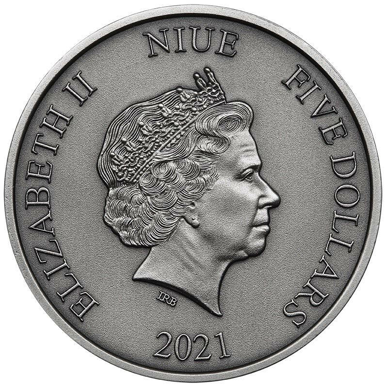 Coin's obverse: Features the effigy of Queen Elizabeth II, along with the issuing year (2021), denomination (5 Dollars ) and country of issue (Niue).