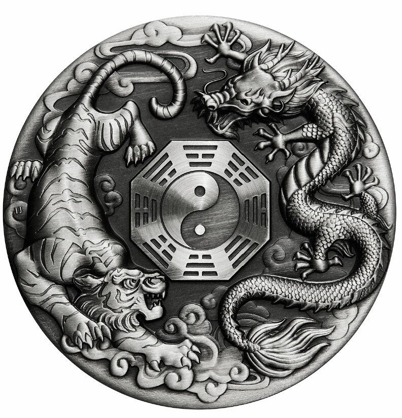 2021 2oz Silver Antiqued Coin - Dragon & Tiger with Bagua