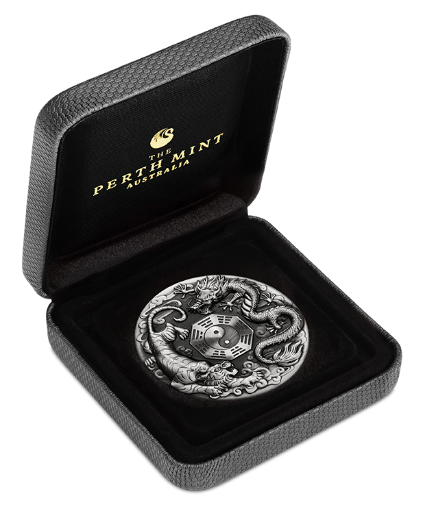 No more than 888 of the Dragon and Tiger with Bagua 2021 2oz Silver Antiqued Coin will be released.