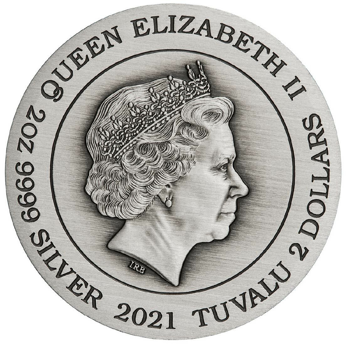 The Ian Rank-Broadley effigy of Her Majesty Queen Elizabeth II appears on the coin’s obverse, which also includes its weight, fineness, monetary denomination and 2021 year-date.