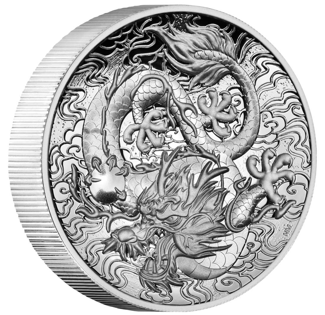 The coin's reverse design portrays a powerful and wise Chinese dragon clasping a pearl in one of its claws. As well as The Perth Mint’s ‘P’ mintmark, the artistry includes representations of clouds, denoting the dragon’s celestial realm.