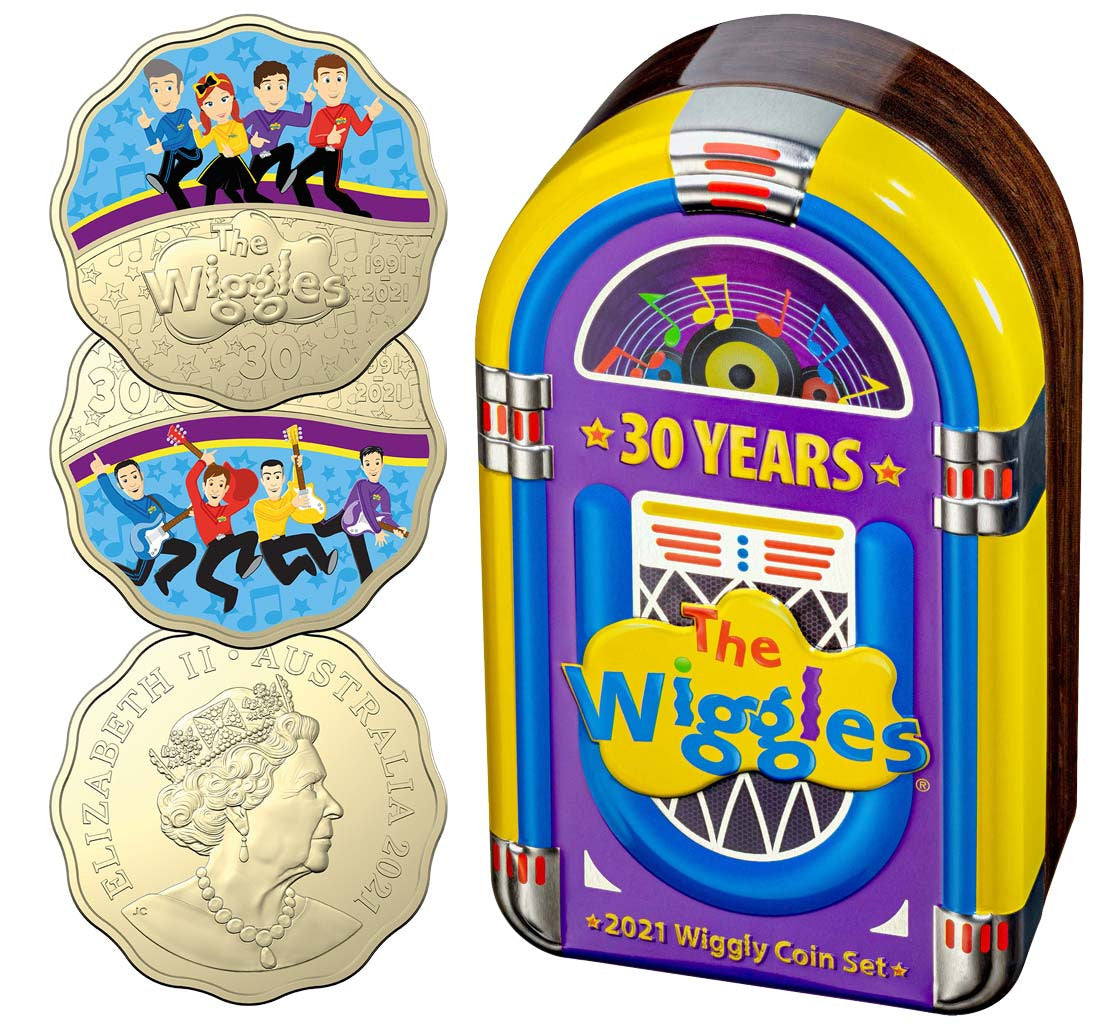 - Coin's reverse features the four Wiggles celebrating 30 years entertaining children with their delightful songs, bright coloured skivvies and wonderful dance moves.
