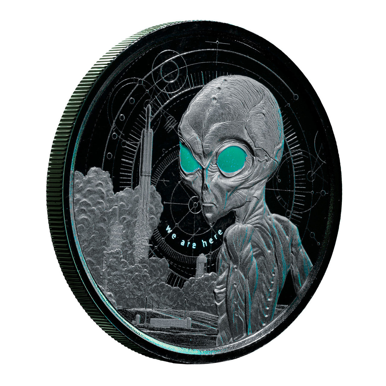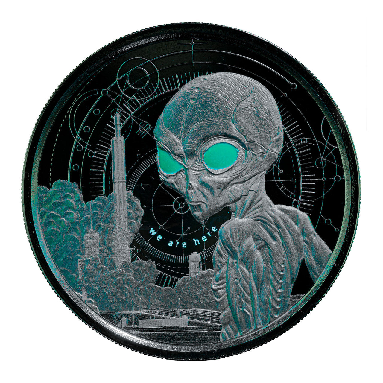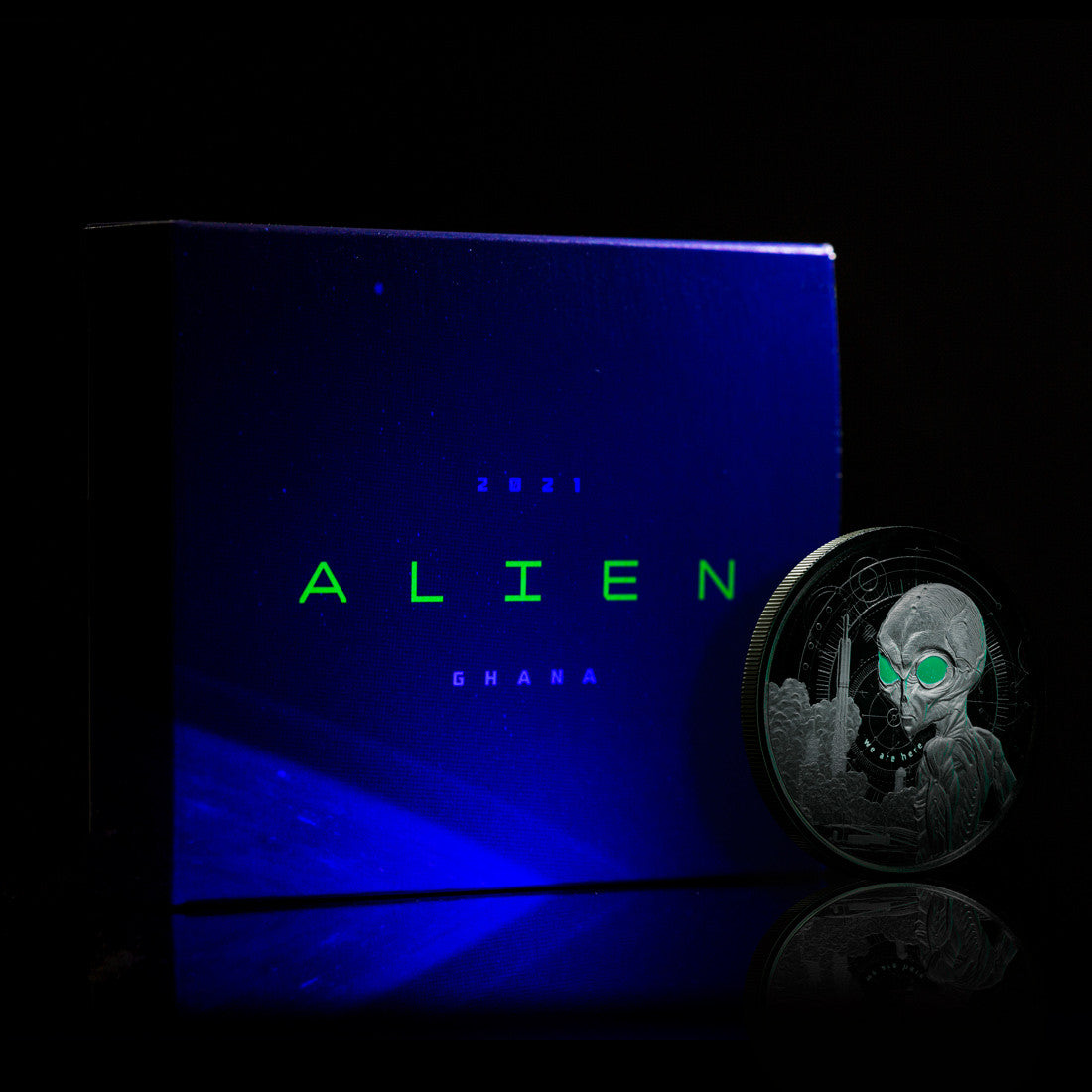 2021 $5 1oz .999 Silver Proof With Colour - Ghana Alien - Glow in the Dark UV Green Eyes & Secret Message "We Are Here"
