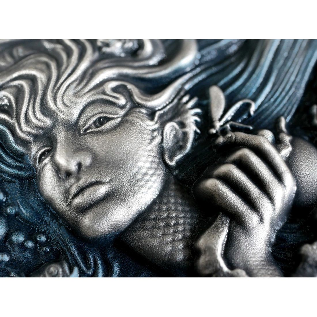 The coin was struck from 3 ounces of pure silver with a total weight of 93.3 grams. The reverse of the coin shows a mysterious image of a rusalka emerging from the water. Around her float aquatic creatures among characteristic vegetation. A special colour print was applied to the water, thanks to which the silver rusalka contrasts wonderfully with the background. The water lily has also been colourfully printed. This flower is deeply rooted in literature, art and heraldry. Below the lily is the gilded name of the coin and the series.