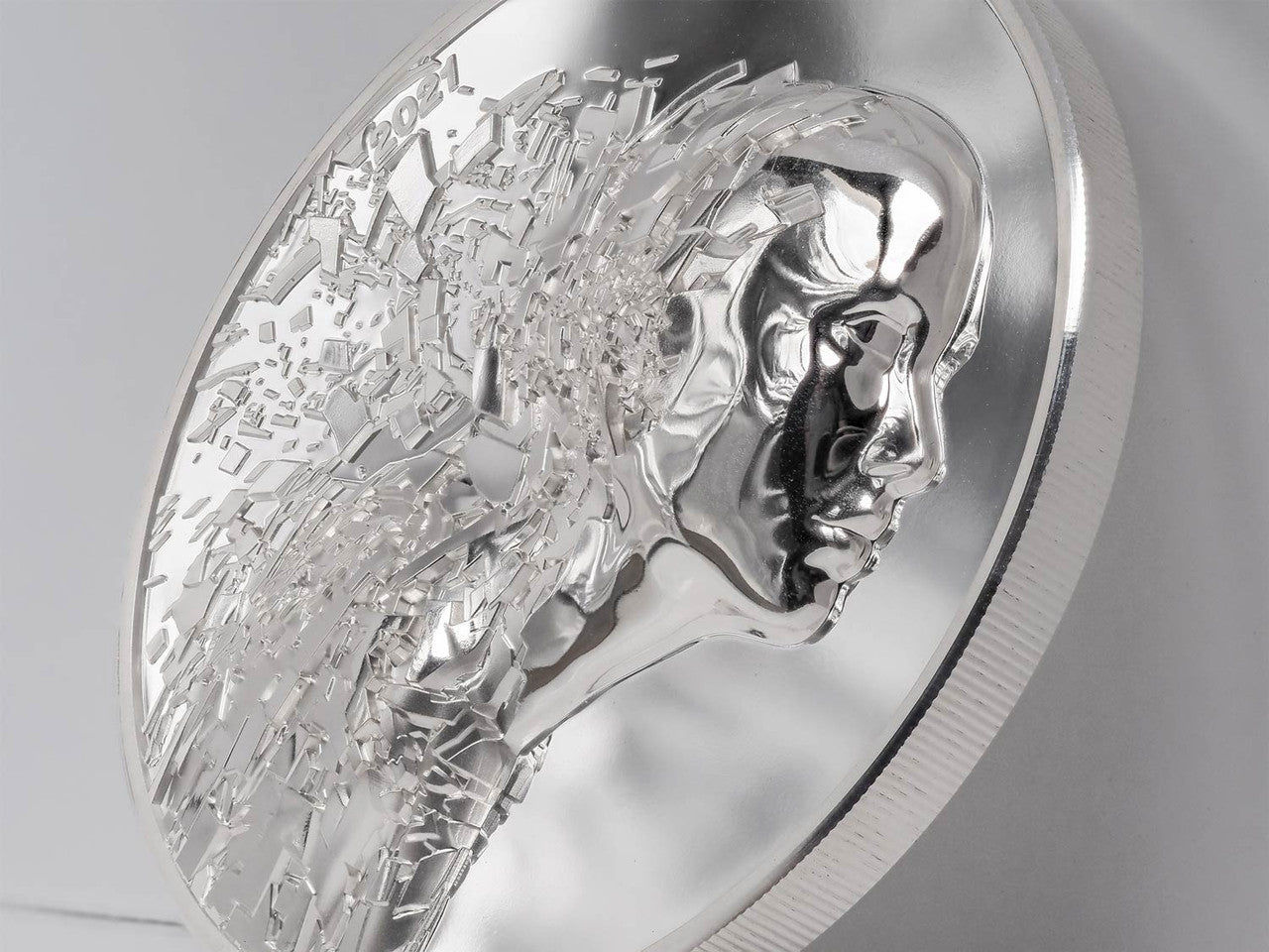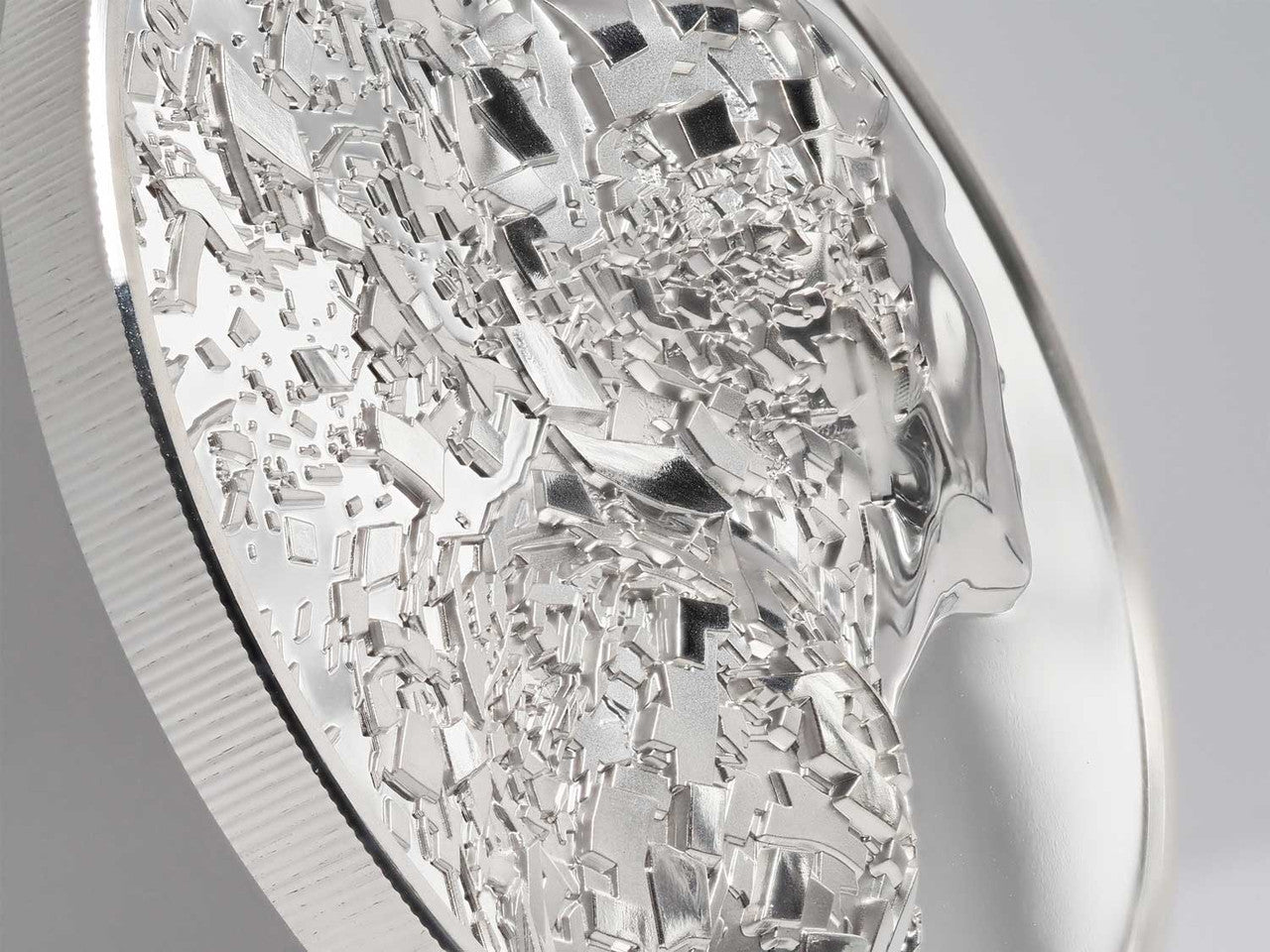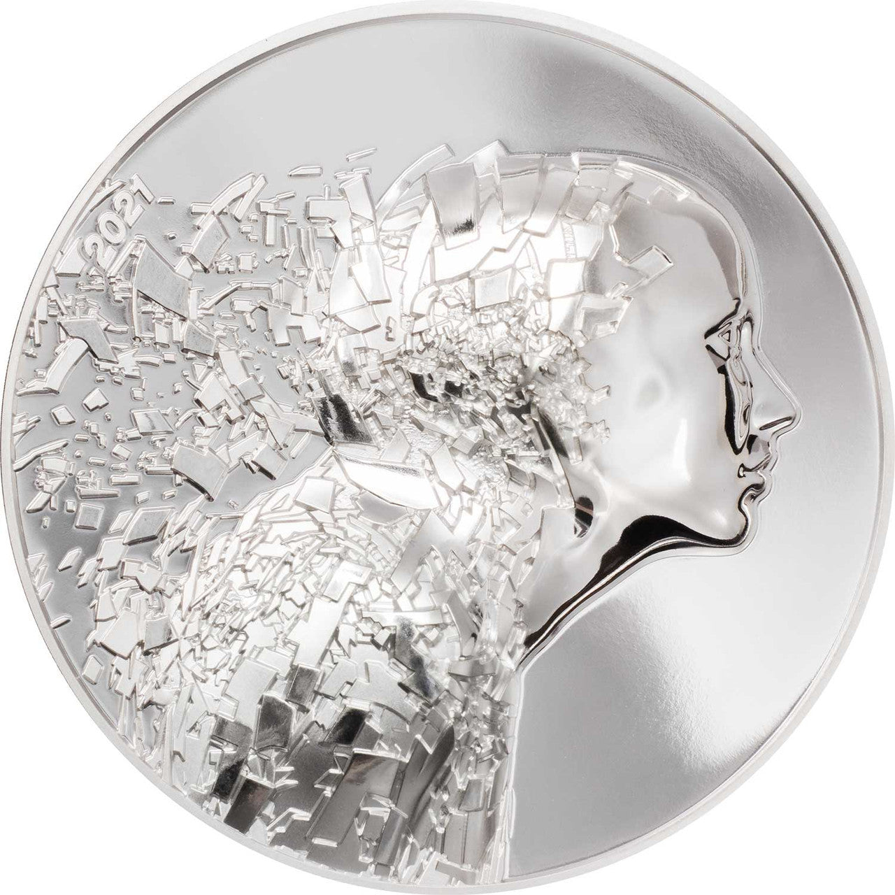 Thanks to the enhanced smartminting® technology this effect of a bursting body is depicted in an artistic way with a stunning combination of proof areas and ultra-high relief elements. Smooth areas of the body are shown to shatter and break apart like glass. This piece of minting art will let you start thinking what’s really left inside of you as you fall apart from overload. Will it be as empty and shallow as this design clearly shows?
