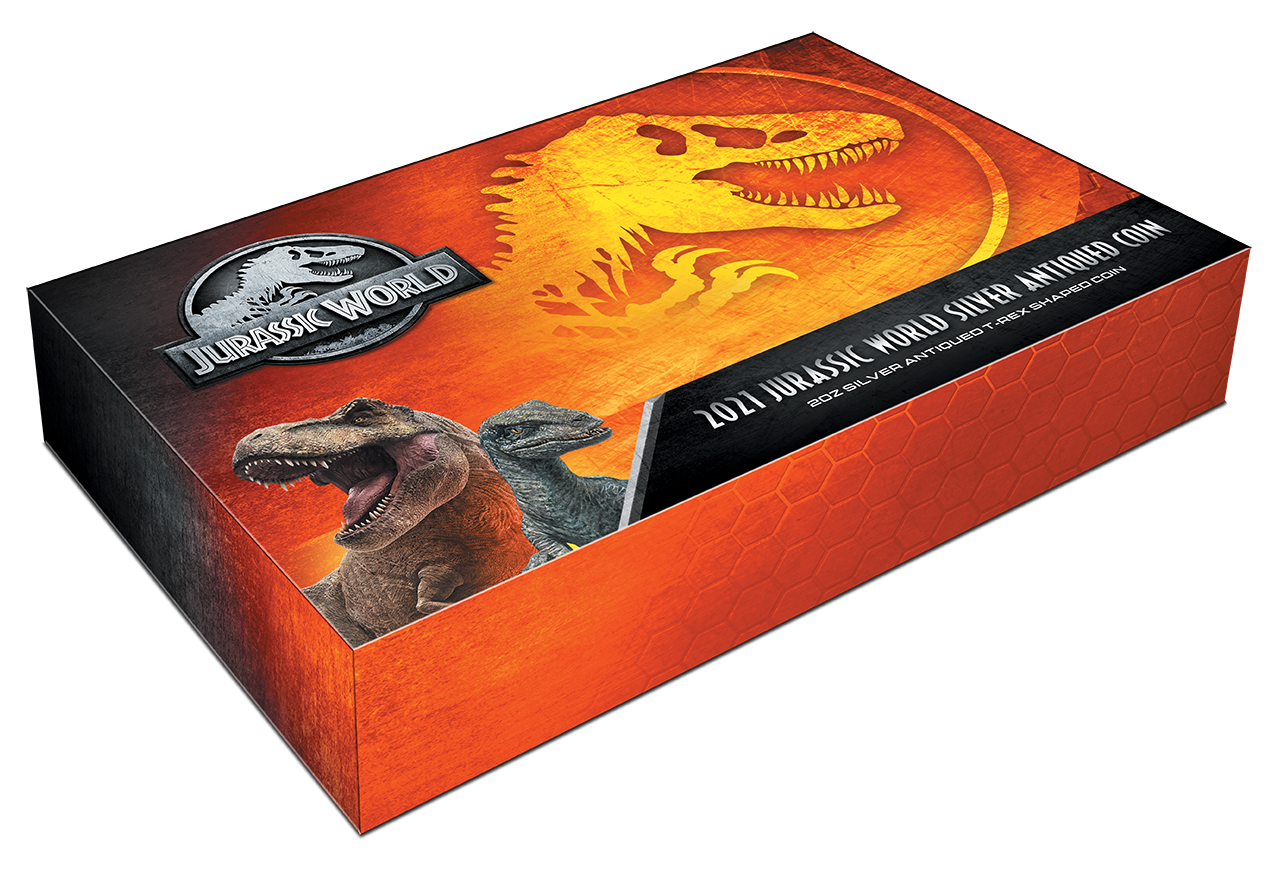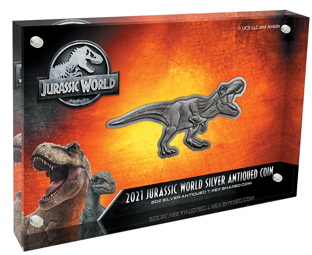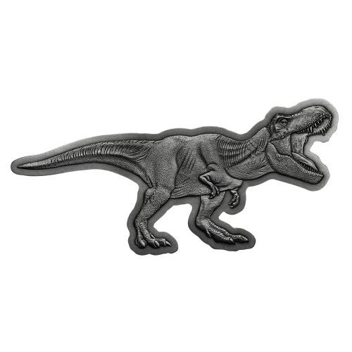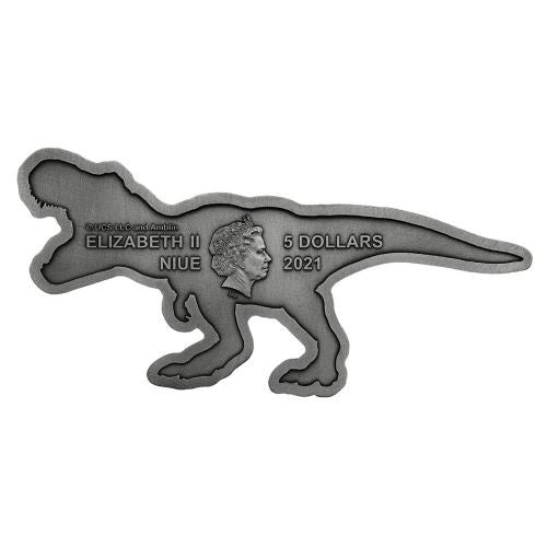 2021 Jurassic World 2oz Silver Antiqued T. Rex Shaped Coin