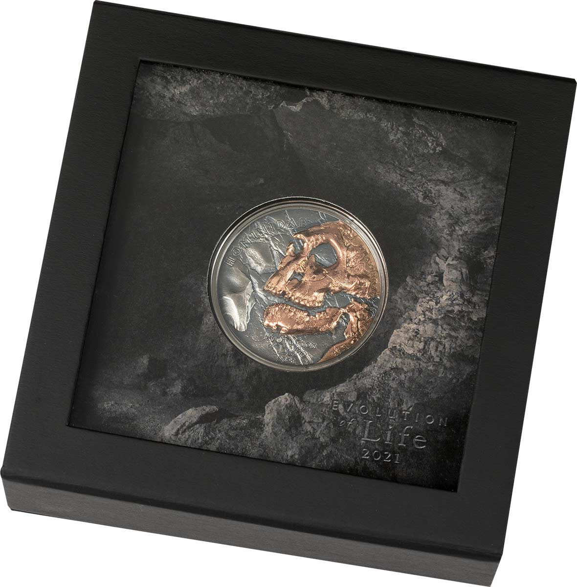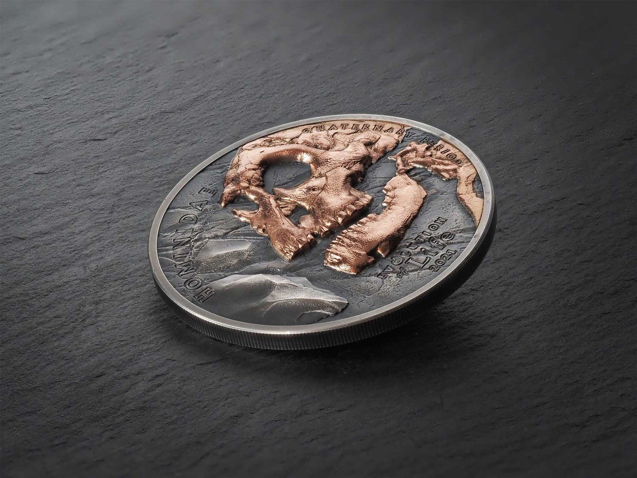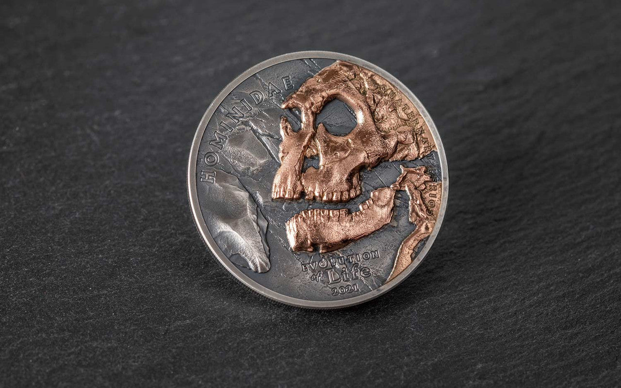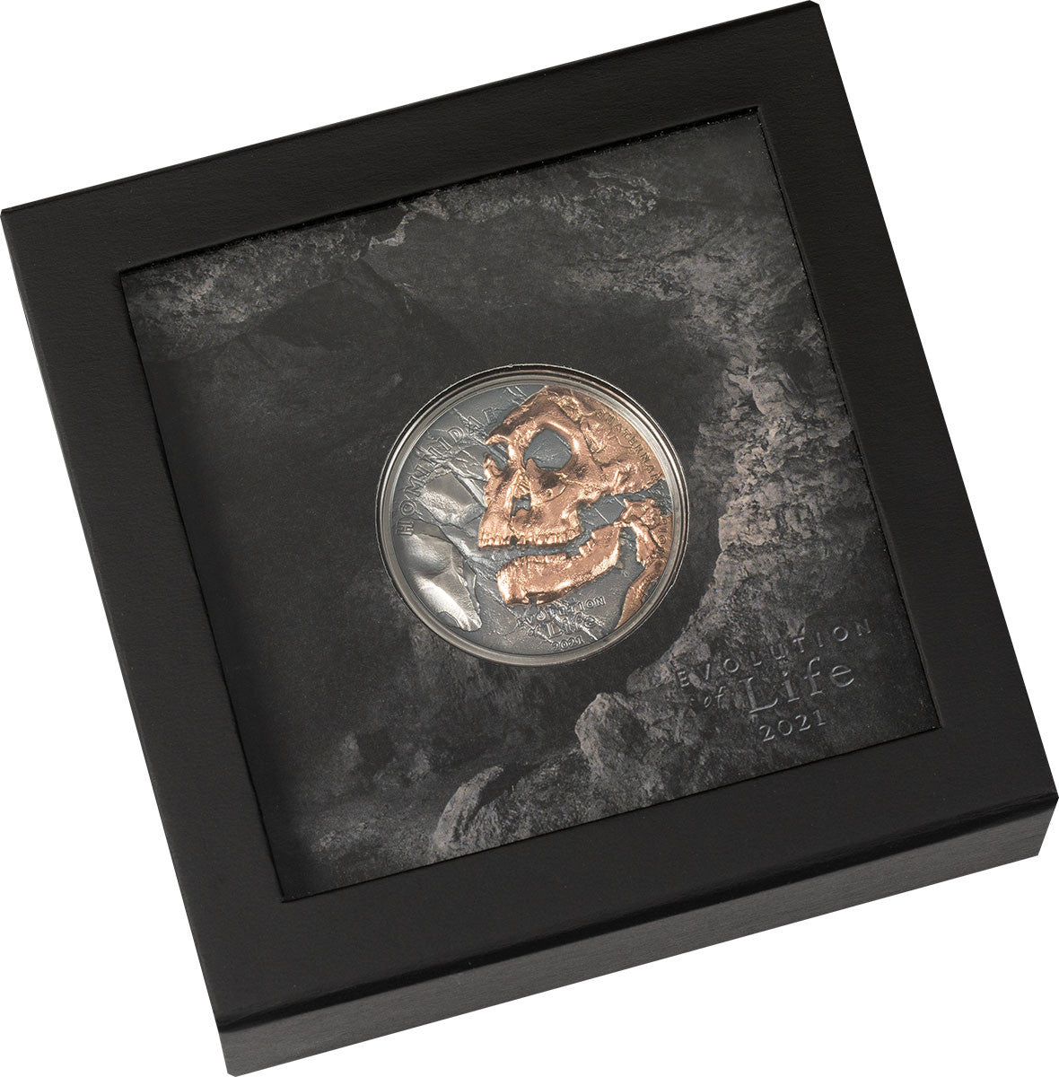 This “Grand Dad” of mankind is now featured on an impressively detailed smartminting® high relief coin. It is supplemented by an Oldowan stone which is a prehistoric tool that dates back to the early stone age. The shimmering rose-gold-plated bones on an antique finish rock background make this coin a perfect addition to your collection.