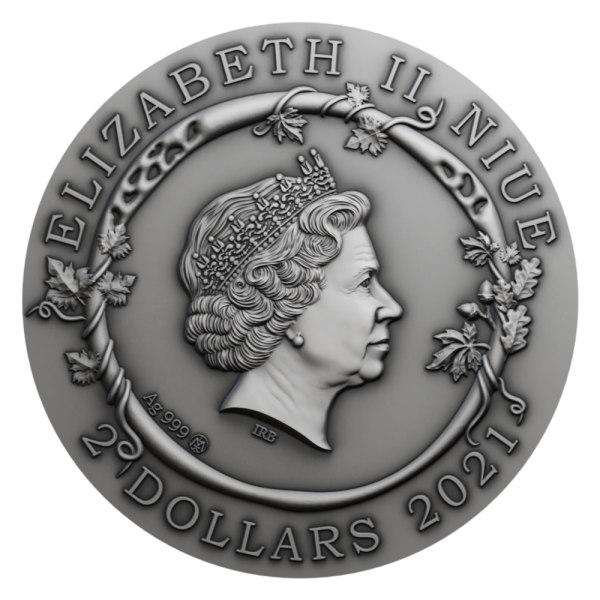 The obverse of the coin features a portrait of Her Majesty Queen Elizabeth II, surrounded by ravishing climbing plants. UV printing and high relief technologies were used to make this new coin. The packaging of the work – a wooden box – has a unique aged design.