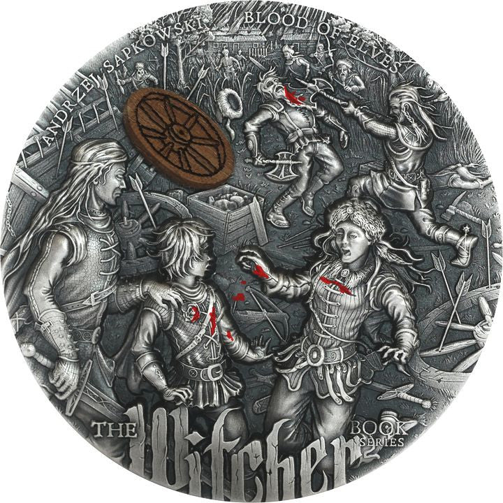 The Blood of Elves coin is minted in 62.2 grams of fine silver. The reverse, 45 mm in diameter, depicts an important scene from Andrzej Sapkowski's book of the same title. It is an attack of Scoia'tael commando group on a dwarven caravan, which Geralt and Ciri were travelling.