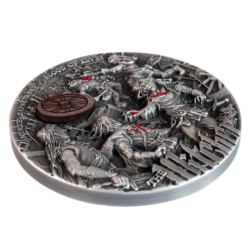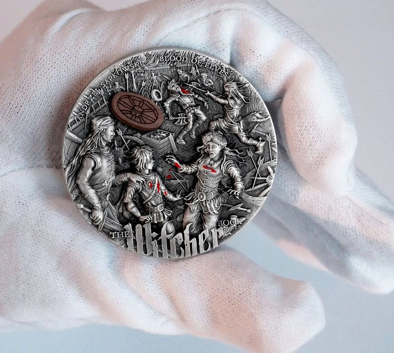 Every detail of the reverse is perfectly visible thanks to the high relief, and the whole thing looks extremely vivid, just like the world presented in Sapkowski's book. Additions also attract the attention. On the reverse there is an addition in the form of selective pink gold, which imitates blood. Another interesting element of the decoration is the wheel, which was handmade from extremely hard wood. The inserts may differ from the one shown in the picture.
