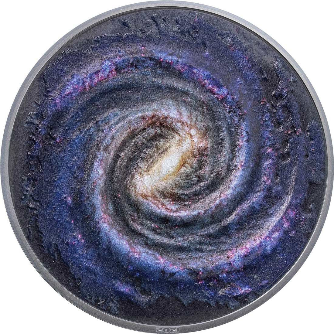 The coin’s reverse depicts the complete Milky Way with its center and arms. Minted in relief with the sinus shaped arms in high relief giving it a 3D effect. It’s coloured almost completely in a way that it looks like you’re looking at the Milky Way from a space ship. It has just the inscription: “2021” at the bottom (the year of issue).