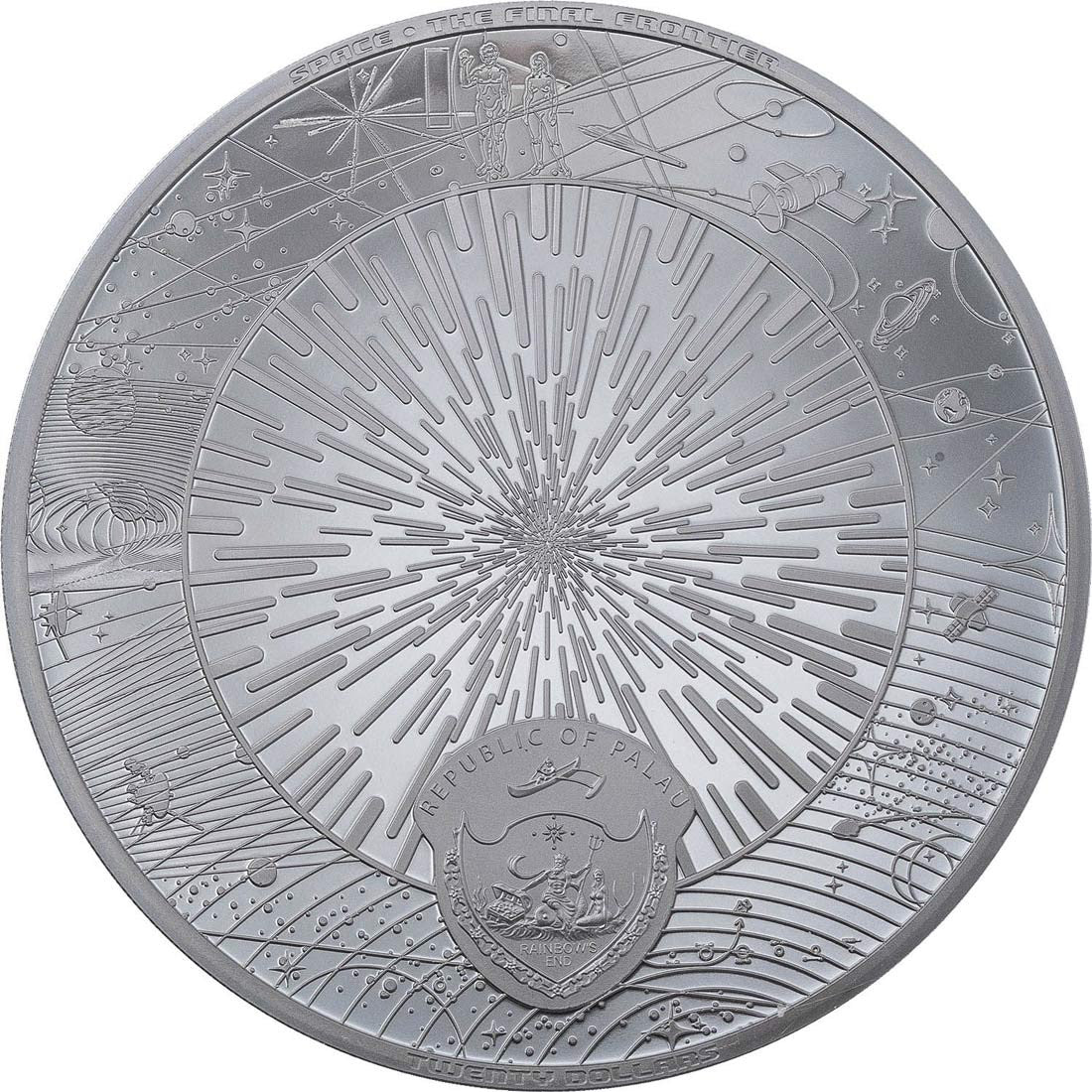 The obverse side of the coin depicts a special Coat of Arms of the Republic of Palau with the inscriptions: “REPUBLIC OF PALAU” (the issuing country) and “10$” (the face value) at the bottom. At the top edge the series inscription ‘SPACE * THE FINAL FRONTIER’. It is decorated with a central part representing the speed of light and surrounded by all kinds of space related ornaments.