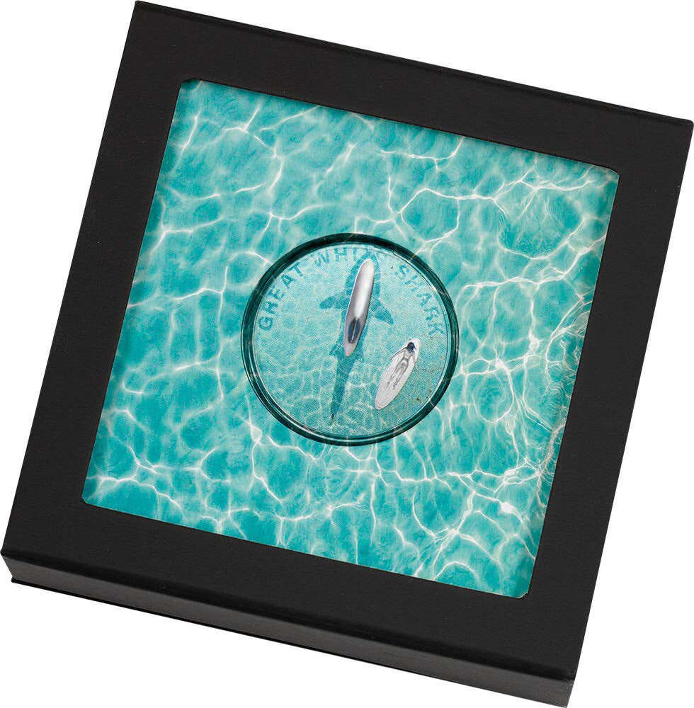 Ever since the Steven Spielberg movie “Jaws”, the thought of an encounter with a Great White Shark has terrified people for decades! This stunning coin will bring you right back to that movie where a surfer and the shark are the main actors.