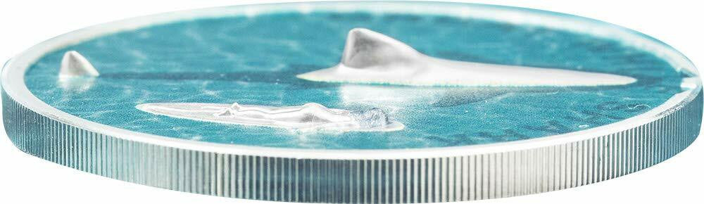When you look at this coin from the top, you will see a remarkable high relief fin coming out of the water. But the real magic happens when you flip this coin to the side where you quickly see the true beast that swims just below the surface!