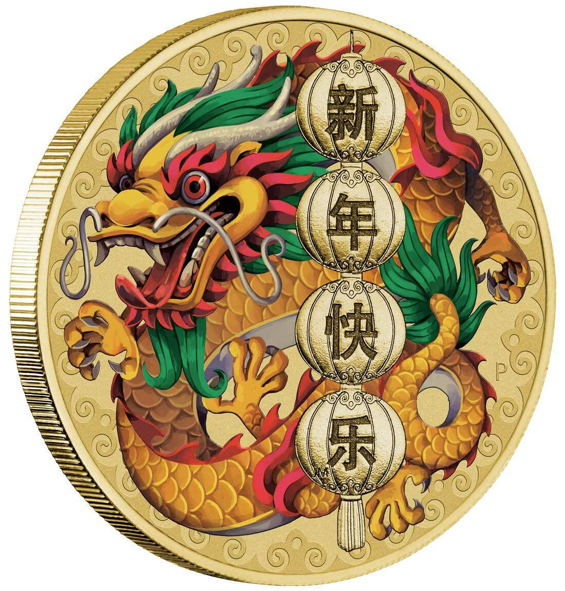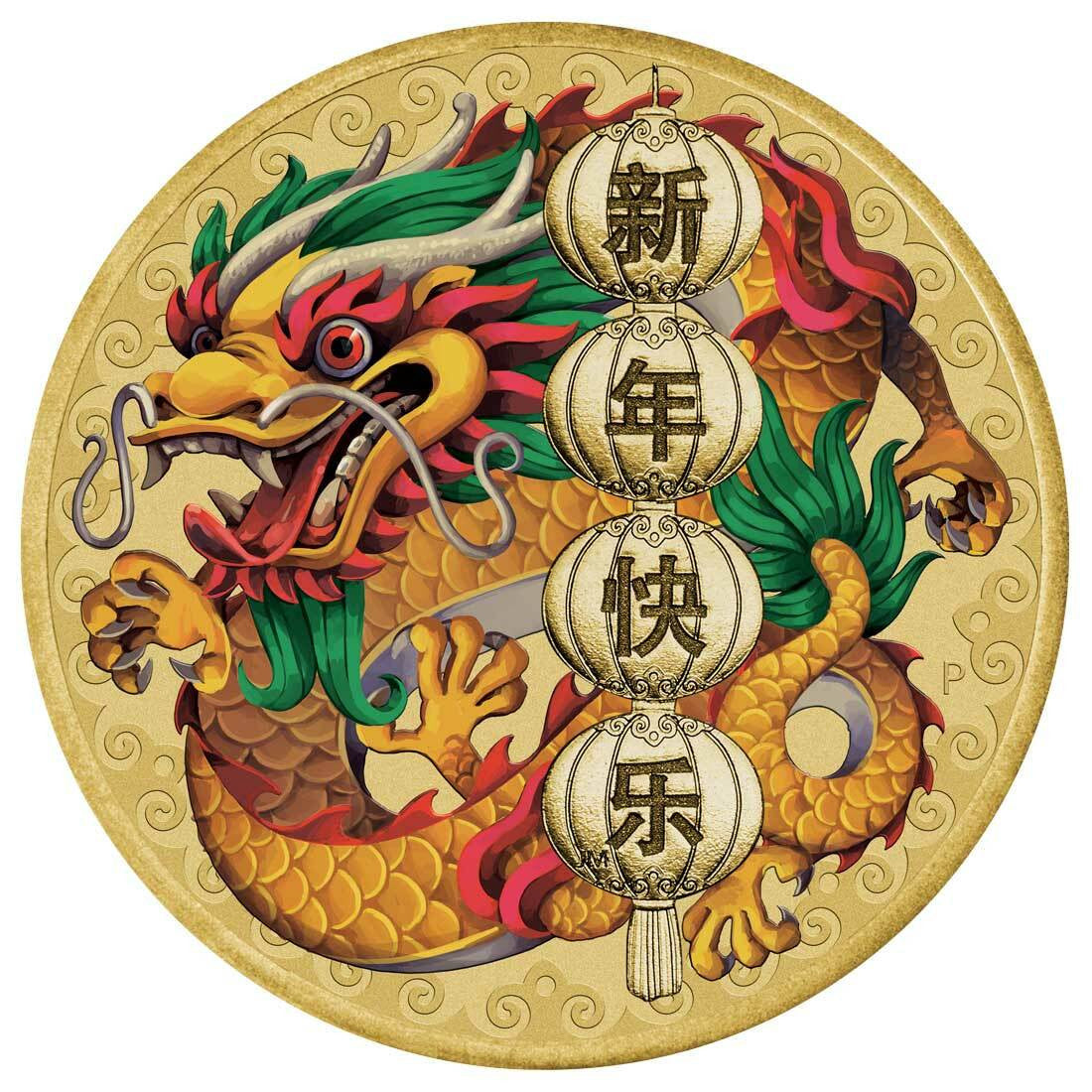 The reverse of the coin depicts a Chinese dragon in colour overlaid with lanterns inscribed with the Chinese characters for ‘Happy New Year’ and The Perth Mint’s traditional ‘P’ mintmark.
