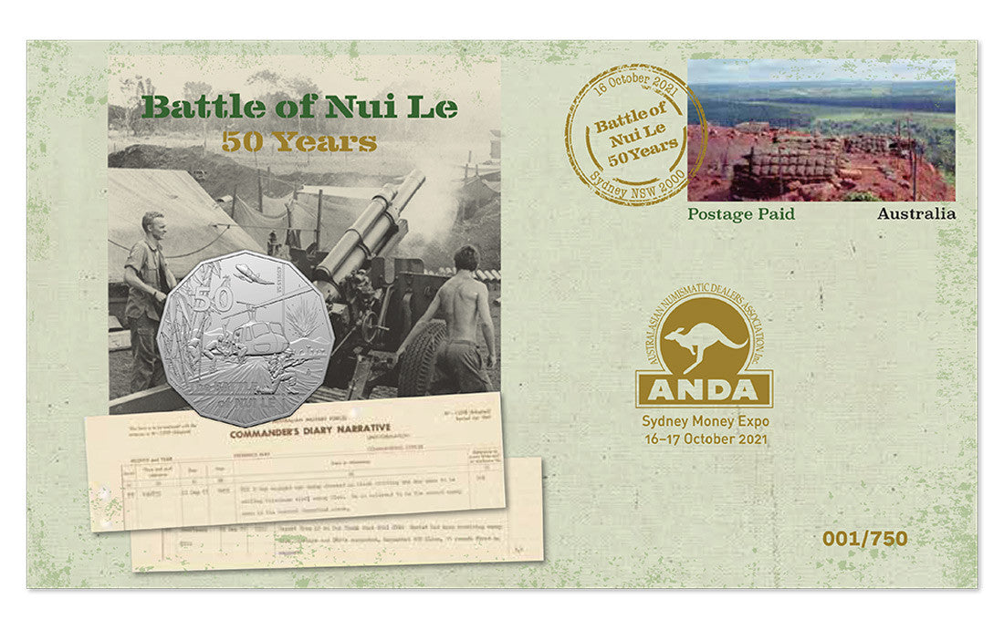 2021 Battle of Nui Le 50 Years ANDA Money Expo Sydney overprint and exclusive to ANDA postal numismatic cover is limited to just 750, featuring a pictorial envelope with a postage paid printed label and a coin from the Royal Australian Mint
