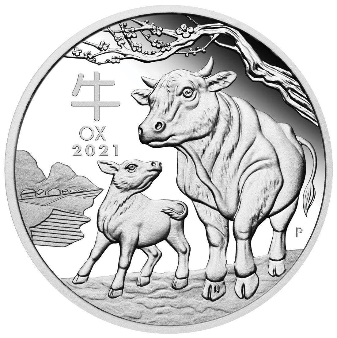 The coin’s reverse portrays a stylised representation of an ox with its calf. In the background a village is depicted among mountains. Also included in the design is a cherry blossom tree, the Chinese character for ‘ox’, the inscription ‘OX 2021’ and The Perth Mint’s ‘P’ mintmark.