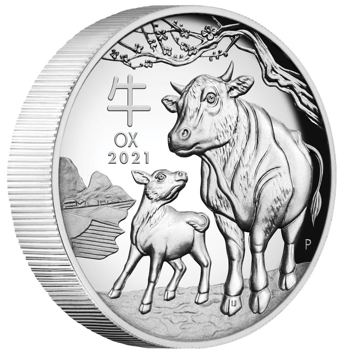 The coin’s reverse portrays a stylised representation of an ox with its calf. In the background a village is depicted among mountains. Also included in the design is a cherry blossom tree, the Chinese character for ‘ox’, the inscription ‘OX 2021’ and The Perth Mint’s ‘P’ mintmark.