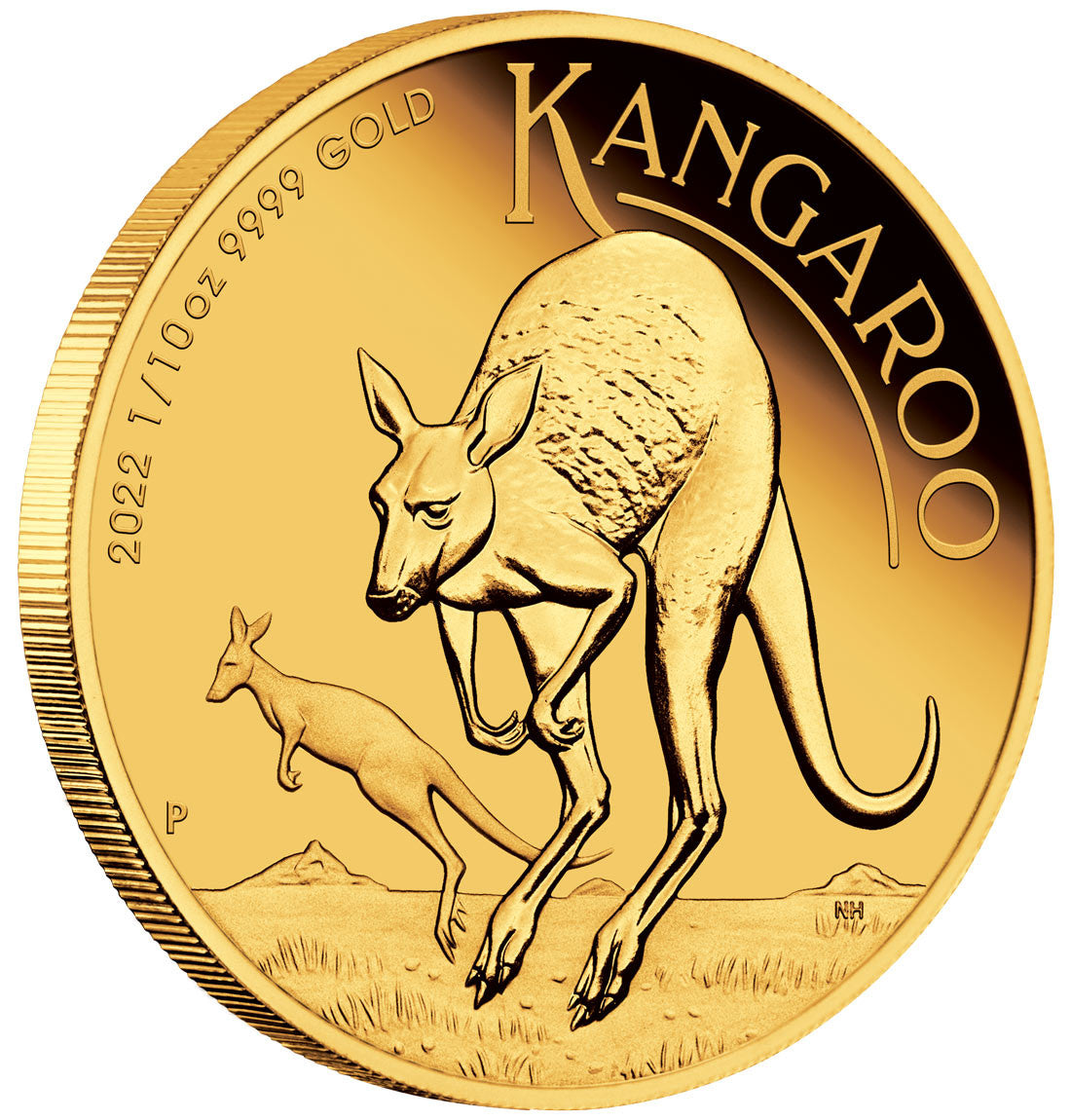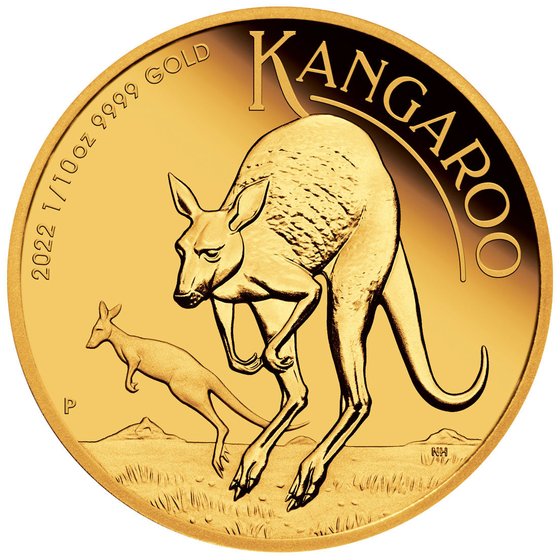 The Perth Mint will release no more than 500 of the Australian Kangaroo 2022 1/10oz Gold Proof Coin.
